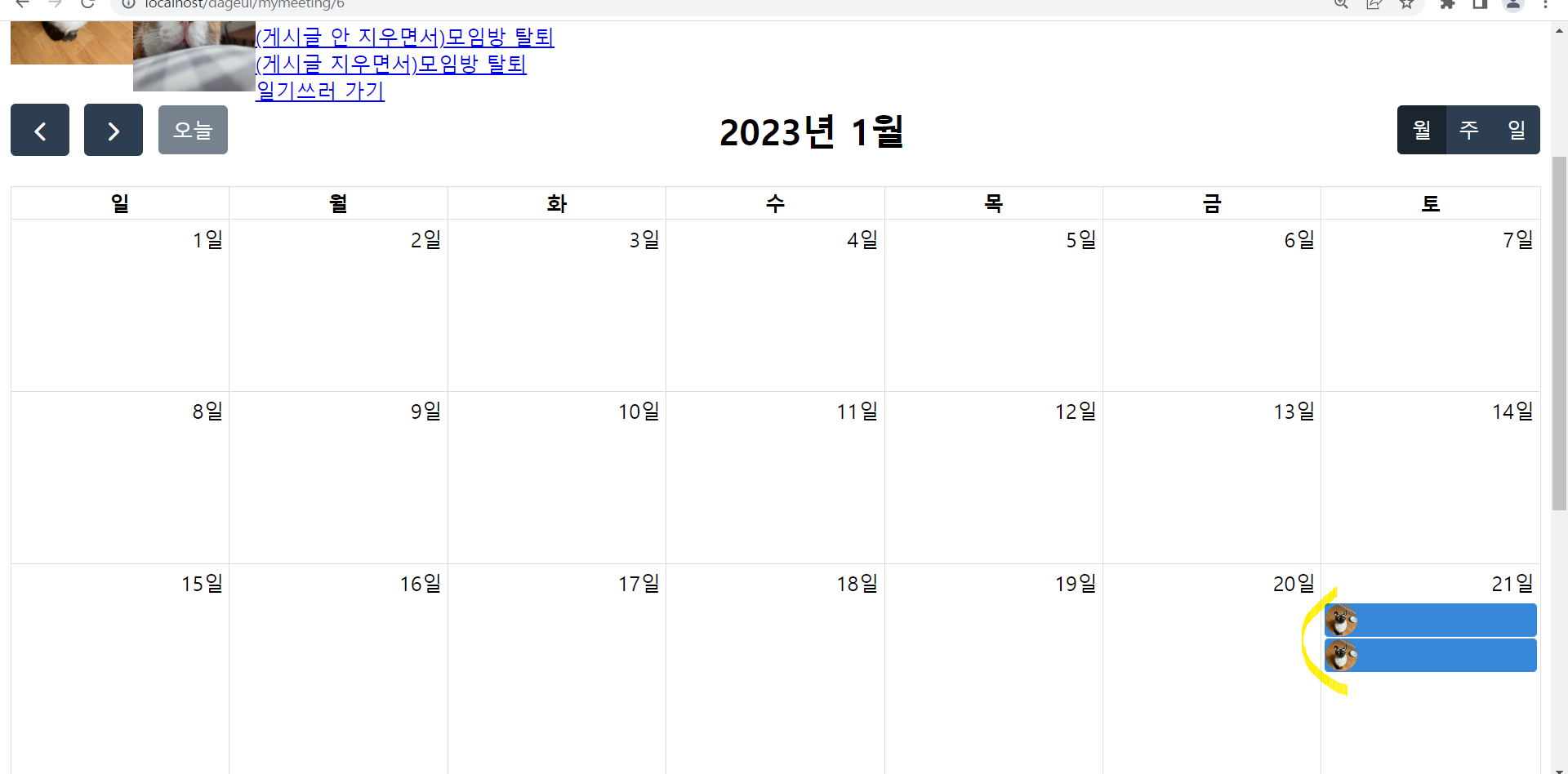 fullcalendar์ ์ผ์ ์ ๋ํ๋ด๋ ๋ฌ๋ ฅ์ ์นํ์ ์ธ๋ฐ ์ด๋ฅผ ์กฐ๊ธ ์์ฉํ์ฌ ์ผ๊ธฐ ๋ฌ๋ ฅ์ผ๋ก ๋ง๋ค์๋ค.