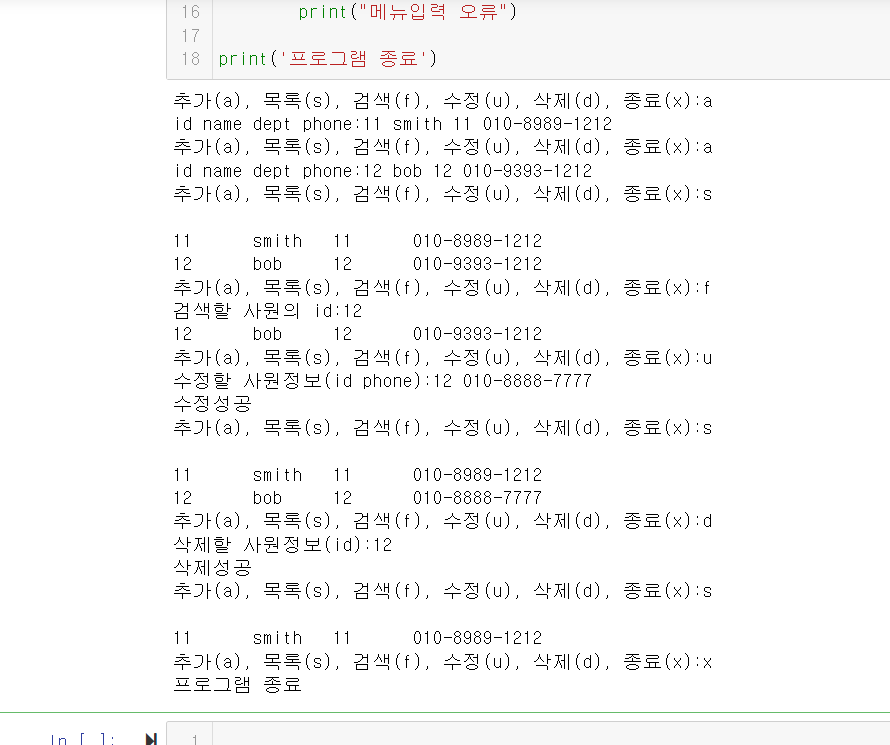 m = "추가(a), 목록(s), 검색(f), 수정(u), 삭제(d), 종료(x):"