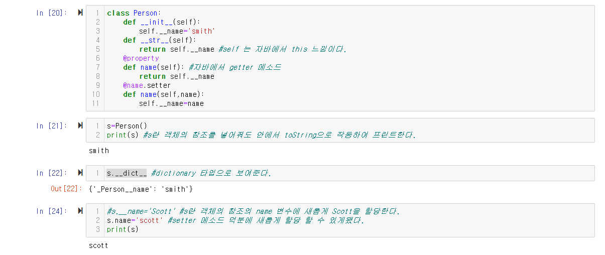 In[24]에서 name 변수에 직접적으로 값을 주는 것같지만 setter 메소드가 호출된 것이다.