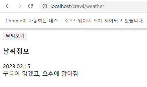 1.์น๋ธ๋ผ์ฐ์ ์์ ๋ ์จ๋ณด๊ธฐ ๋ฒํผ์ ๋๋ฅด๋ฉด ajax์์ฒญ์ด /craw/weather์ผ๋ก ์ ๋ฌ๋๋ค
