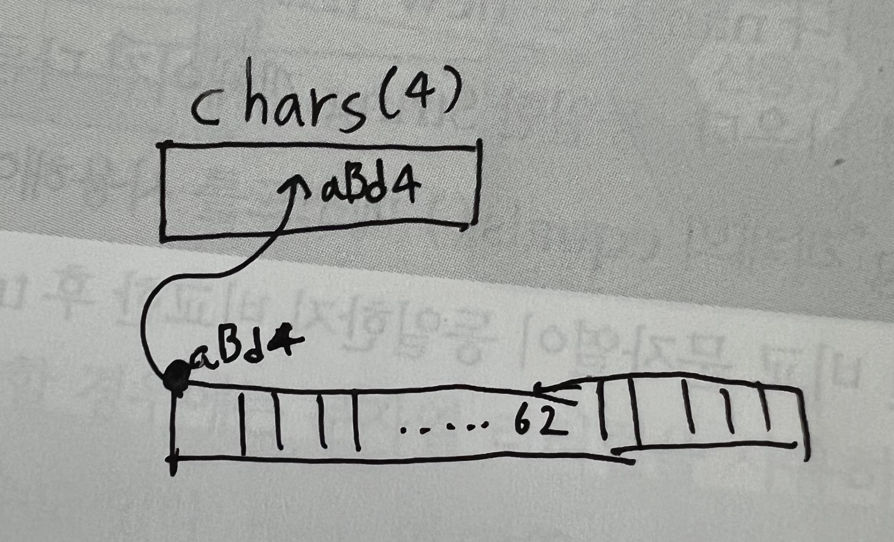 ์ ์ 62๊ฐ๋ฅผ ์ ์ฅํ ์ ์๋ ์ ๊ฐ์ฒด์ ์ฐธ์กฐ๊ฐ aBd4์ธ๋ฐ aBd4๋ผ๋ ์ฐธ์กฐ ์ ๋ณด๋ฅผ chars์ ์ ์ฅํ๋ผ