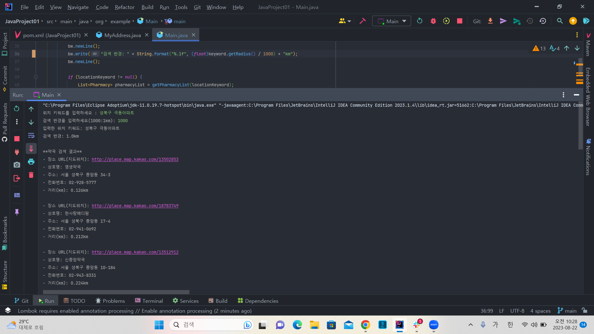 - ํน์ ์์น(ํค์๋) ์ฃผ๋ณ์ ์ง์ ๋ ๋ฐ๊ฒฝ ๋ด์์ ์ฃผ์ ์๋ฅผ ๊ฒ์ํ๋ Java ์ดํ๋ฆฌ์ผ์ด์ ์ ๊ฐ๋ฐํฉ๋๋ค.