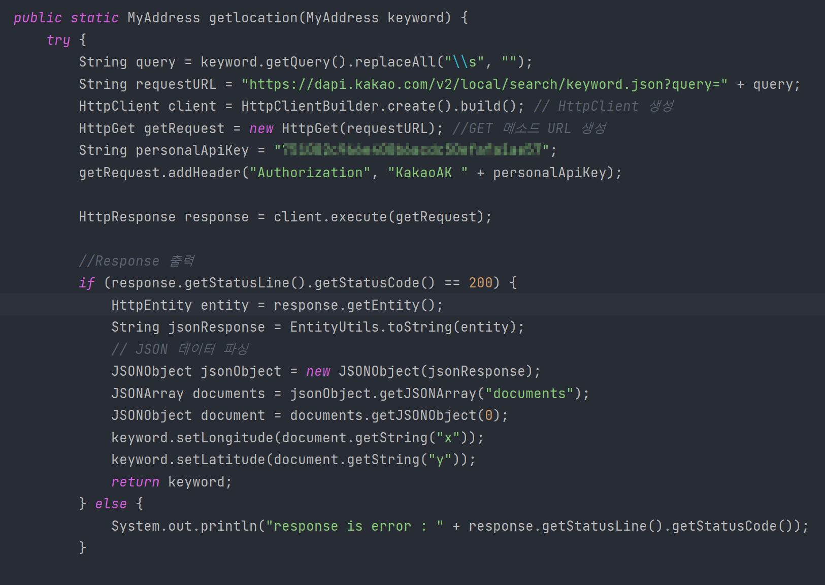 ์ถ๋ ฅ์ผ๋ก๋ ์๋ต์ ์ํฐํฐ๋ก ๋ฐ์ json ํํ๋ก ๋ณด๋ด์จ ์๋ต์ jsonobject๋ก ๋ฐ๊ณ ๋ฐฐ์ด์ธ documents๋ฅผ ํ์ฑํ ํ ์ ค ์ฒซ๋ฒ์งธ ๊ฐ๋ง ๊ฐ์ ธ์ค๊ธฐ ์ํด์ 0์ ๋ฃ์ด ์ฒซ๋ฒ์งธ jsonobject๋ฅผ ๊ฐ์ ธ์จ๋ค.