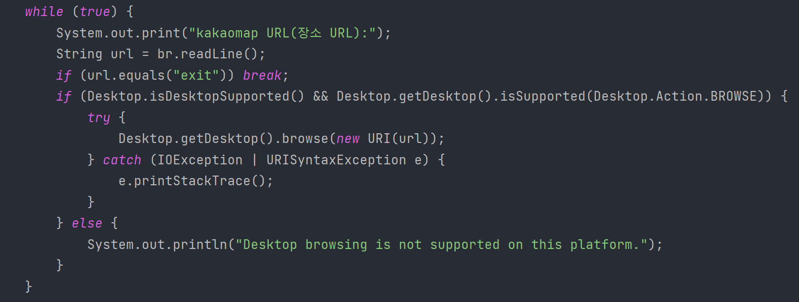 ์๋ฐ์์ ์ ๊ณตํ๋ java.net.URI ๋ฅผ ์ฌ์ฉํ์ฌ ์ฝ์์ url๋ฅผ ์ ๋ ฅํ์ ๋ ๋ฐ๋ก ๋ธ๋ผ์ฐ์ ์ ์นํ๋ฉด์ ๋์ฐ๊ฒ ํ๋ค.