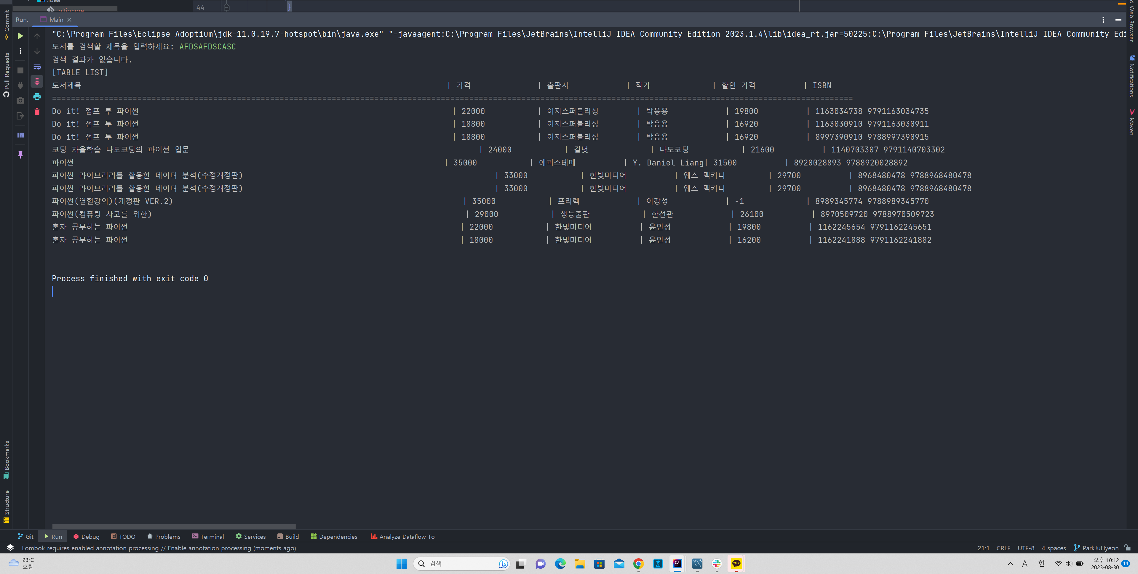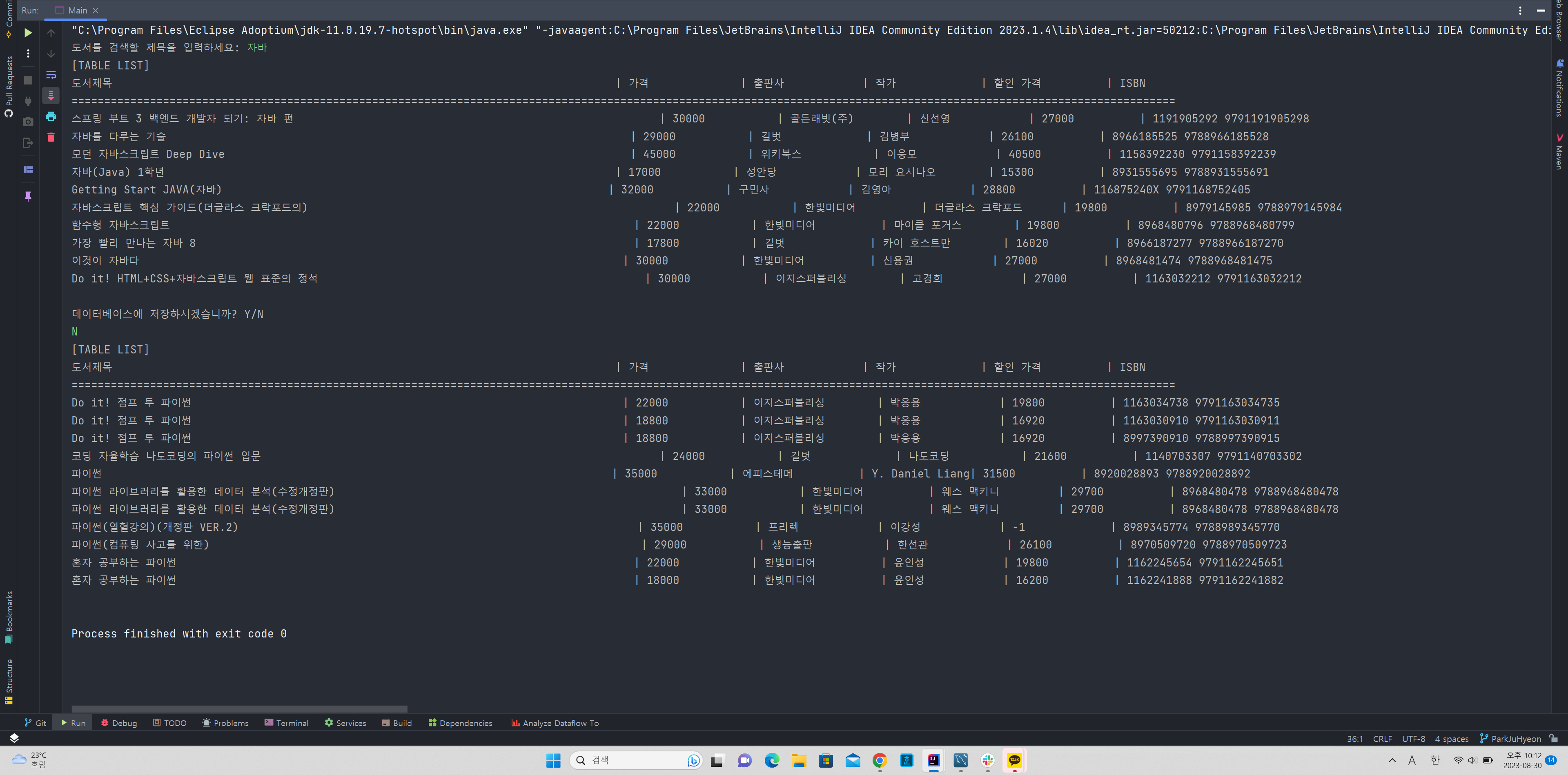 - ๊ฒ์ํ ์ฑ ์ ๊ดํ ์ ๋ณด๋ฅผ ๋์ ์ ๋ชฉ, ๊ฐ๊ฒฉ, ์ถํ์ฌ, ์ ์, ํ ์ธ ๊ฐ๊ฒฉ ๋ฐ ISBN๊ณผ ๊ฐ์ด ์ ์ ํ ์ ๋ณด๋ก ์ถ๋ ฅํฉ๋๋ค.