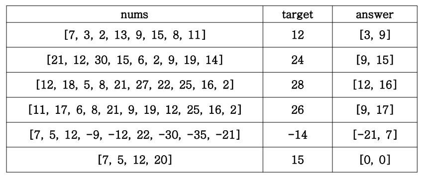 ๋งค๊ฐ๋ณ์ nums์ ๊ธธ์ด๊ฐ n์ธ ์์ด์ด ์ฃผ์ด์ง๊ณ , ๋งค๊ฐ๋ณ์ target์ ์์ฐ์ ๊ฐ์ด ์ฃผ์ด์ง๋ฉด ์ด ์์ด์์์ ๋ ๊ฐ์ ์์์ ํฉ์ด ์ ์ target๊ฐ์ด ๋๋ ๋ ์์๋ฅผ ๊ตฌํด ๋ฐฐ์ด์ ์ค๋ฆ์ฐจ์์ผ๋ก ๋ด์ ๋ฐํํฉ๋๋ค.