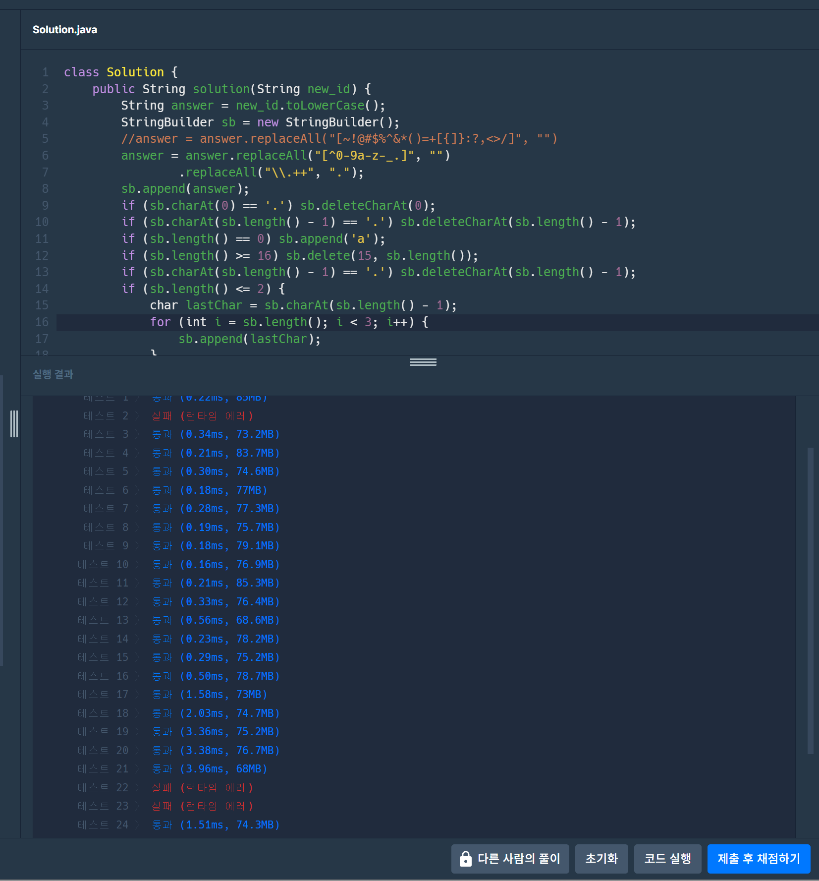 μλ₯Ό λ€μ΄, new_id κ°μ΄ "...!@BaT#*..y.abcdefghijklm" λΌλ©΄, μ 7λ¨κ³λ₯Ό κ±°μΉκ³ λλ©΄ new_idλ μλμ κ°μ΄ λ³κ²½λ©λλ€.