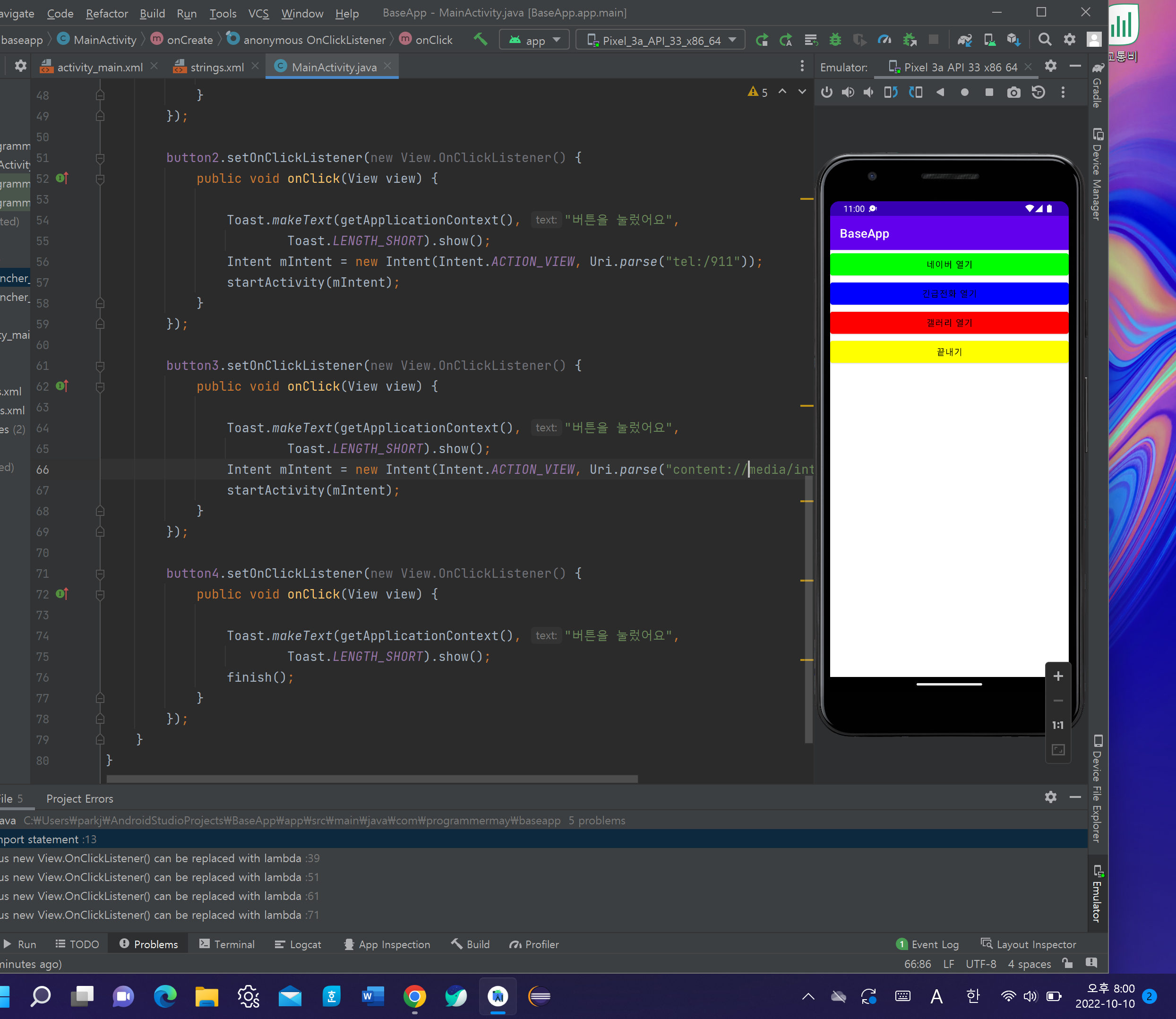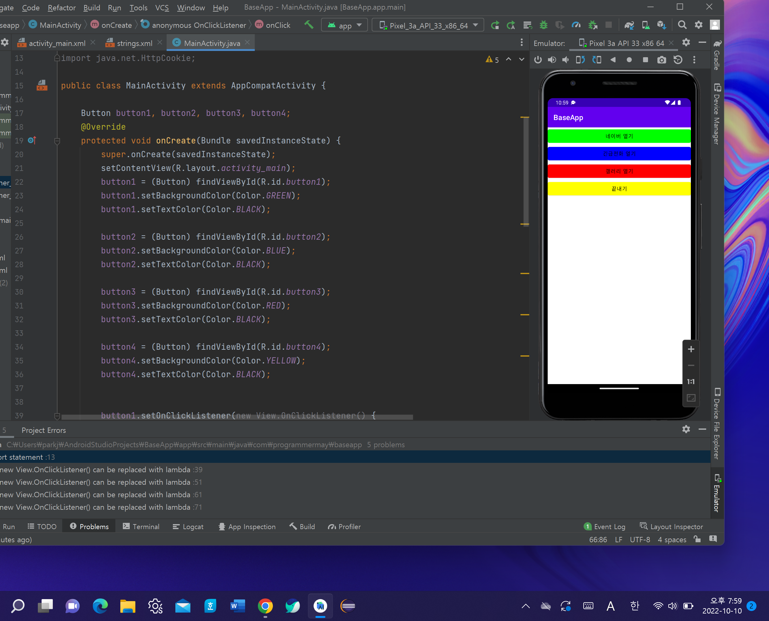 ๊ทธ ๋ค์ activity_main.xml์ ํ์ผ์์ ๋ง๋ ๋ฒํผ(Button) ๊ฐ์ฒด์ ๋ํด ์ ๊ทผํด์ผ ํ๋๋ฐ findViewById() ๋ฉ์๋๋ฅผ ์ฌ์ฉํ๋ฉด๋๋ค. " .setBackgroundColor() " ๋ฉ์๋๋ฅผ ์ด์ฉํ์ฌ ๋ฒํผ์ ์๊น์ ์ ํ๊ณ , " .setTextColor() " ๋ฉ์๋๋ฅผ ์ด์ฉํ์ฌ ๋ฒํผ ์์ ์ ํ๋ ๊ธ์จ์ ์์์ ์ ํด์ค๋ค.