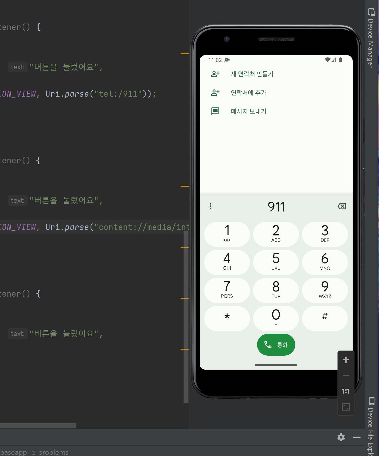 Intent mIntent = new Intent(Intent.ACTION_VIEW, Uri.parse("tel:/911"));