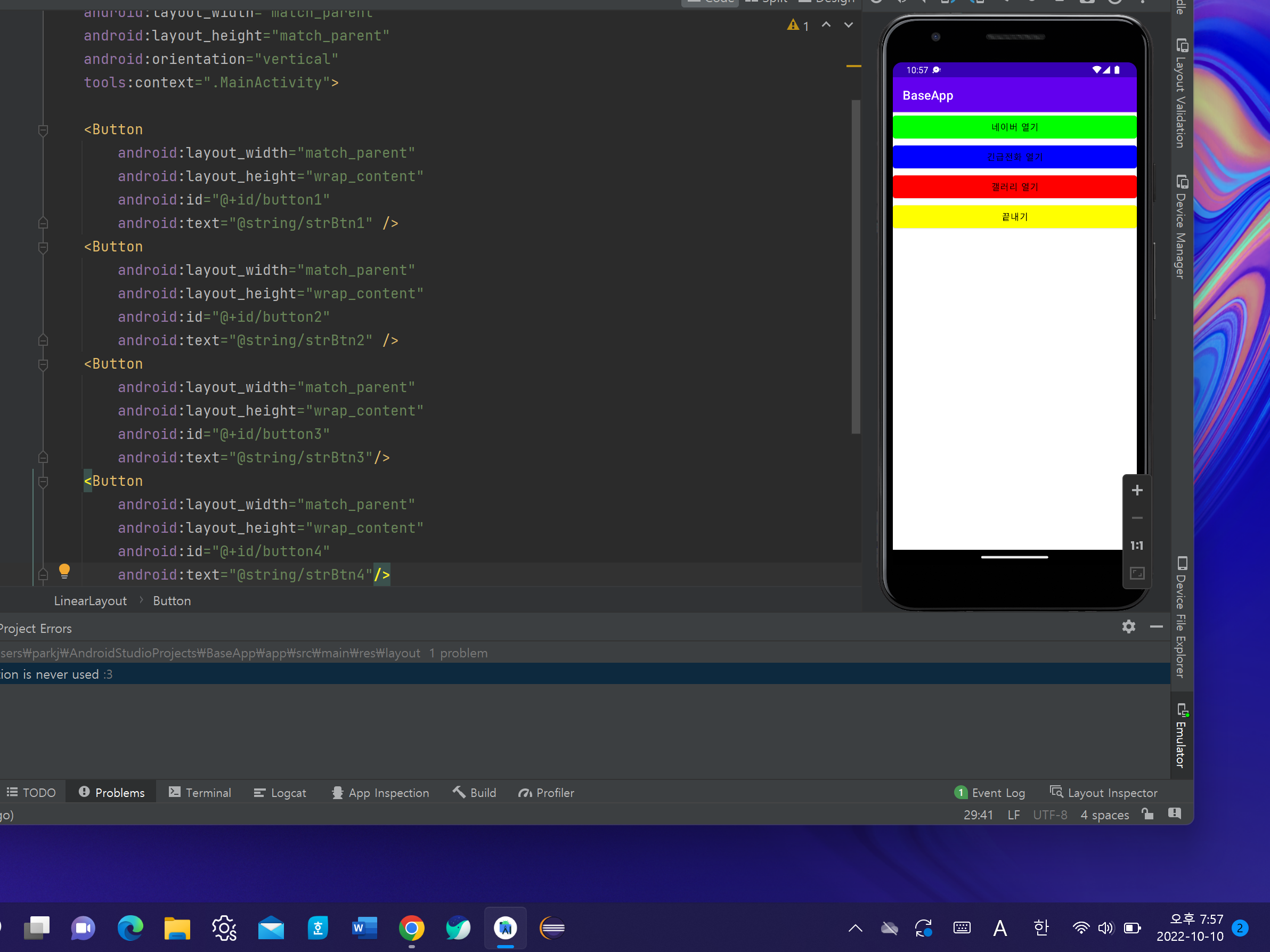 ๋ชจ๋ ๋ทฐ(view) ์ ๋ทฐ์์ ์์๋ ๊ฒ์ ์์ด๋๋ฅผ ๊ฐ์ง ์ ์๋๋ฐ, ์์ด๋(id)๋ " @+id/์ง์ ์์ด๋ " ํ์์ผ๋ก ์ด๋ค. @์ ๋ฆฌ์์ค์์ ์ฐธ์กฐํ๋ผ๋ ์๋ฏธ์ด๊ณ @+๋ ๋ฆฌ์์ค์ ์ถ๊ฐํ๋ผ๋ ์๋ฏธ์ด๋ค. ์ฌ๊ธฐ์ ๊ฐ ์ง์ ์์ด๋๋ button1,2,3,4๋ก ํด์ฃผ์๋ค.