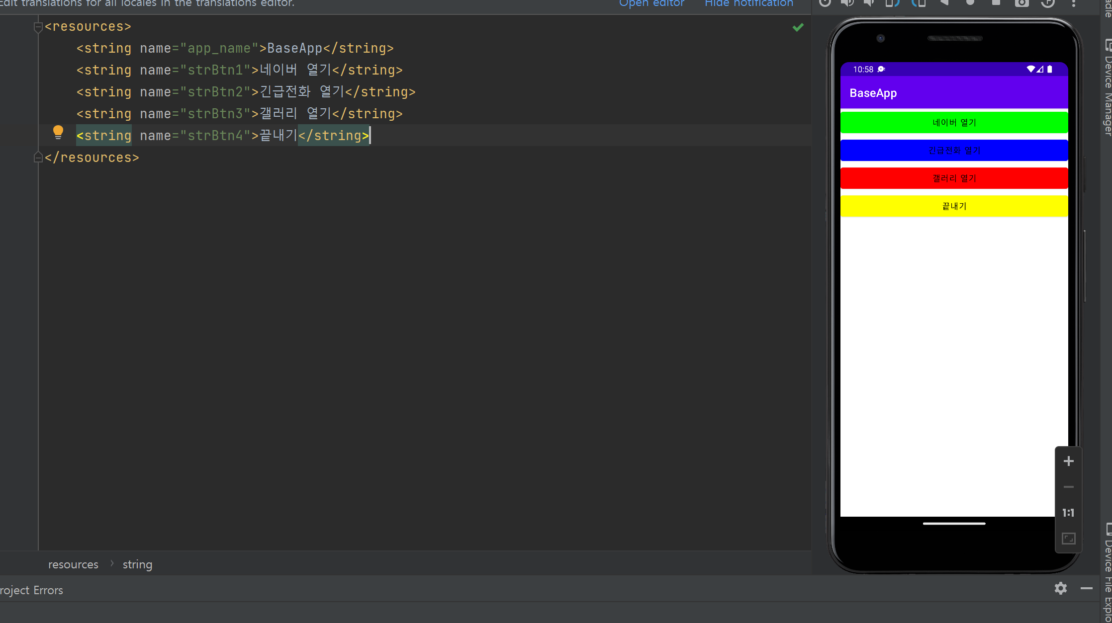 text ์์ฑ์ ๋ฒํผ์ ์ฐ์ผ ๊ธ์์ด๋ค. ์ง์ text="๋ค์ด๋ฒ ์ด๊ธฐ" ๋ผ๊ณ ์จ๋ ๋ฌด๋ฐฉํ์ง๋ง ์๋๋ก์ด๋์์ ๋ฌธ์์ด์ ๋๋๋ก strings.xml์ ๋ชจ์๋๋ ๊ฒ์ด ์ข๋ค. "@string/๋ฌธ์์ด ์ด๋ฆ"์ strings.xml ํ์ผ์ ํด๋น ๋ฌธ์์ด ์ด๋ฆ์ผ๋ก ๋ฌธ์์ด์ด ์ง์ ๋์ด ์๋ค๋ ์๋ฏธ์ด๋ค.