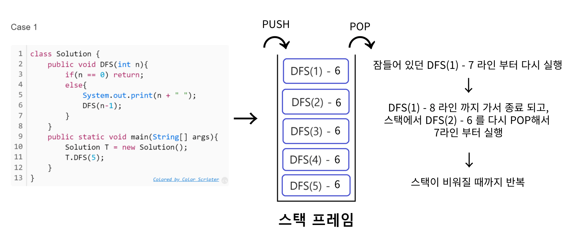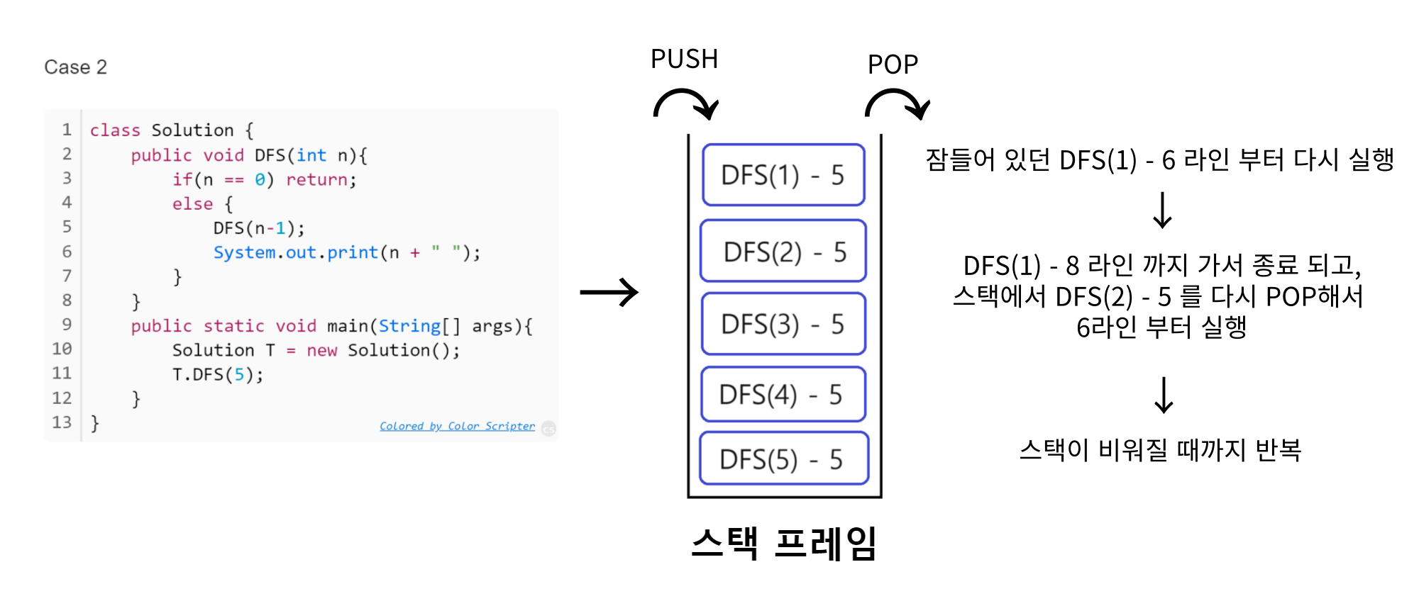 λ§€κ°λ³μμ 5λ₯Ό λ£μ΄μ DFS() ν¨μλ₯Ό νΈμΆνμλ€. λ§€κ°λ³μλ 0 μ΄ μλλ―λ‘ 4λ² νμ΄ μ€νλλ€. 5λ² νμ΄ μ€νλμ΄ 5κ° μΆλ ₯λκ³ , μκΈ° μμ μΈ DFS() ν¨μ(λ§€κ°λ³μ : 4)λ₯Ό νΈμΆνκ³ κΈ°μ‘΄ DFS(5)λ λ§€κ°λ³μμ λ³΅κ· μ£Όμλ₯Ό κ°κ³ μ€νμ PUSH λμ΄ sleep μνκ° λλ€. μ΄ κ³Όμ μ΄ λ°λ³΅λλ€.