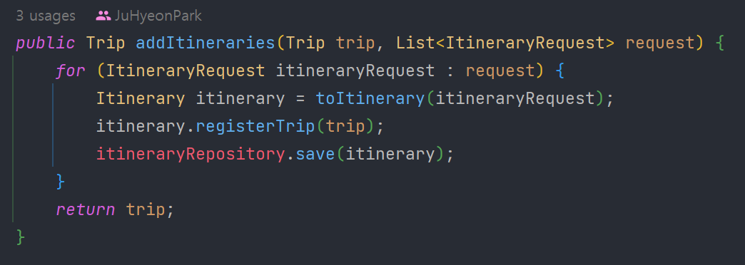 Trip returnedTrip = itineraryService.addItineraries(otherTrip, requests);