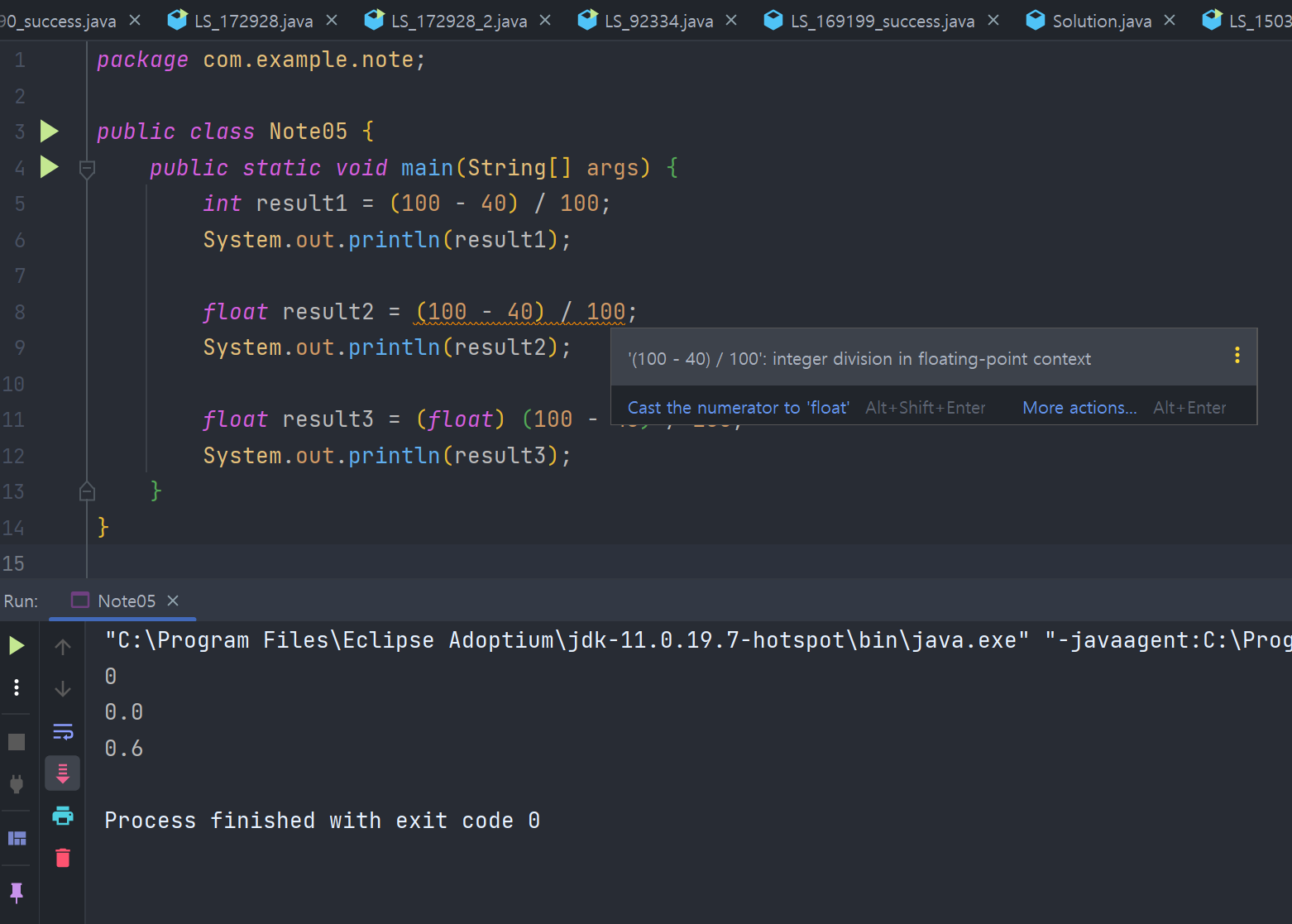 μμ κ°μ΄ μμ±νλ€λ©΄, integer division in floating-point context λΌλ IDEμ κ²½κ³ λ¬Έκ΅¬λ₯Ό νμΈν μ μλ€.