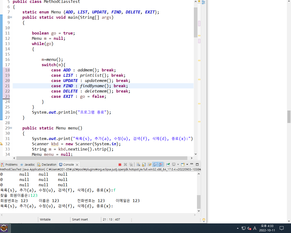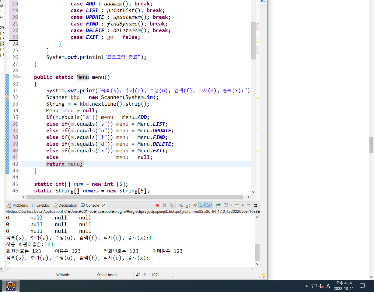 ๊ทธ๋ฆฌ๊ณ return ๊ฐ๋ Menu ํ์ ๋ฆฌํดํด์ผํ๊ธฐ ๋๋ฌธ์ ์ฌ์ฉ์์ ํค๋ณด๋์์ ๋ฐ์์จ ๊ฐ๊ณผ ๊ฐ์ ๋ ๊ทธ์ ๋ง๋ Menu ํ์ menu๋ฅผ ๋งค์น ์์ผ์ค๋ค.