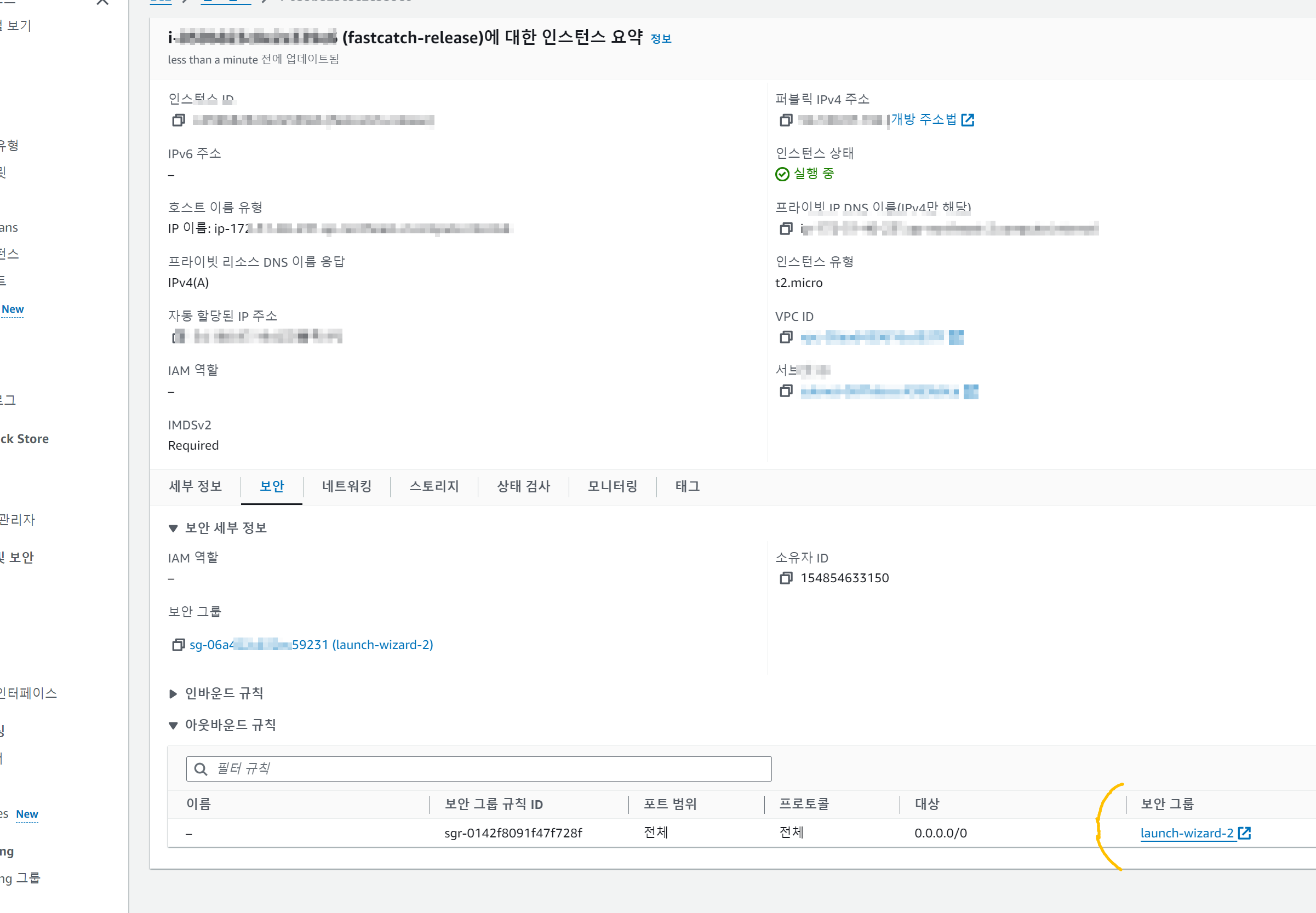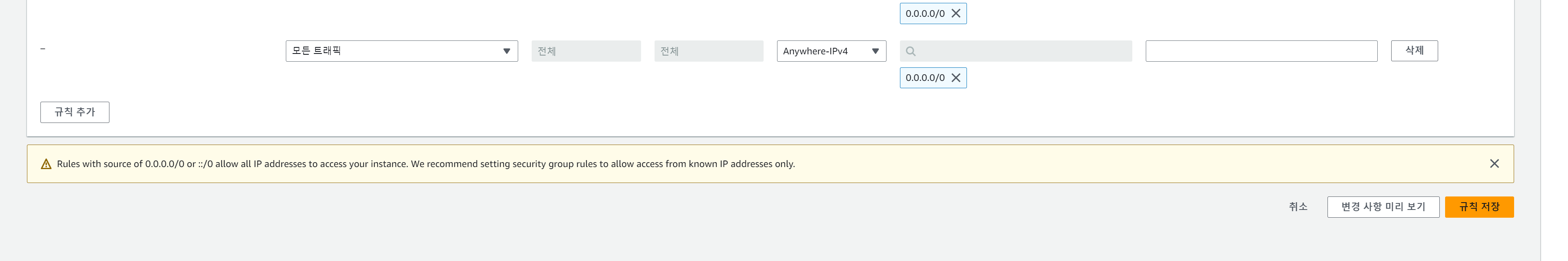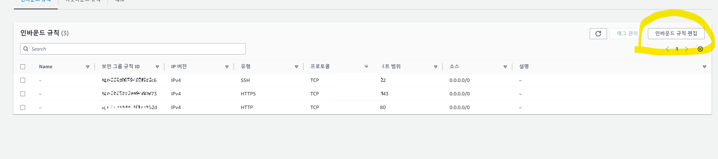 ๋ฐฉํ๋ฒฝ ๋ณด์ ๊ทธ๋ฃน์ผ๋ก๋ ๊ธฐ๋ณธ์ผ๋ก SSH ํต์ ์ด ํ์ฉ๋์ด ์๋ค. ๋์ค์ HTTP , HTTPS ํต์ ์ ํ ์ง ๋ชจ๋ฅด๋ ์ฒดํฌํด์ ํธ๋ํฝ์ ํ์ฉํด์ฃผ์๋ค.