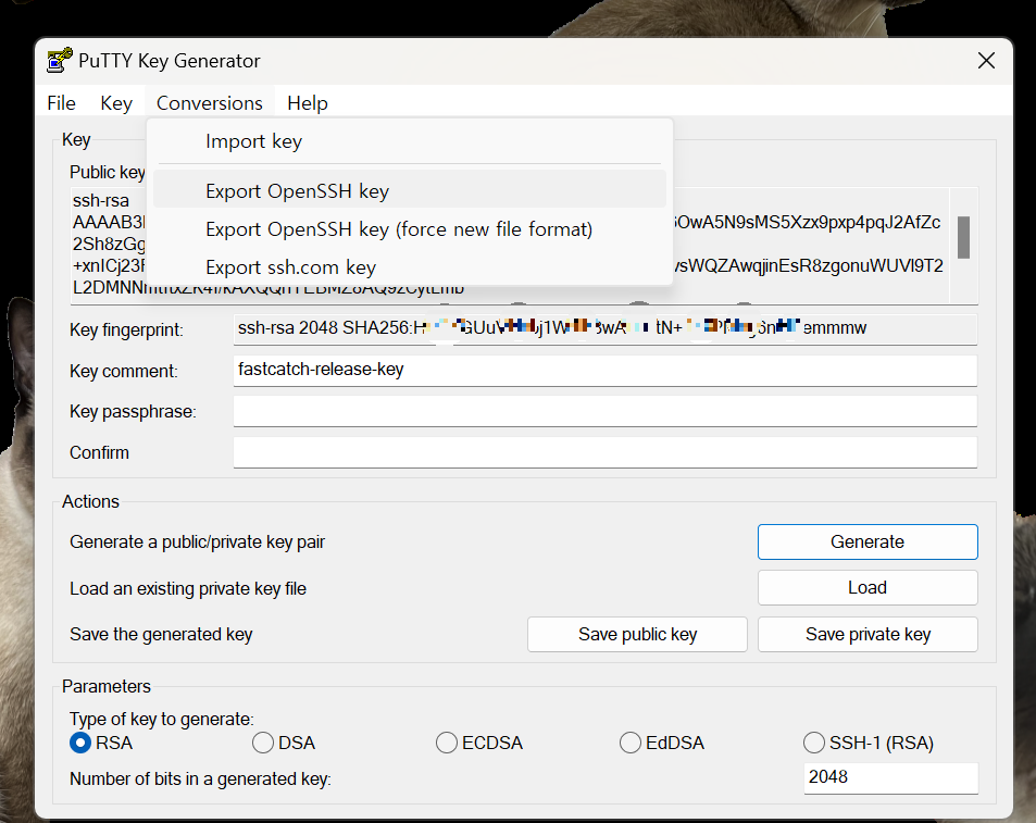 Export Open SSH key๋ฅผ ํด๋ฆญํ์ฌ OpenSSH Key๋ฅผ ์์ฑํด์ค๋ค.