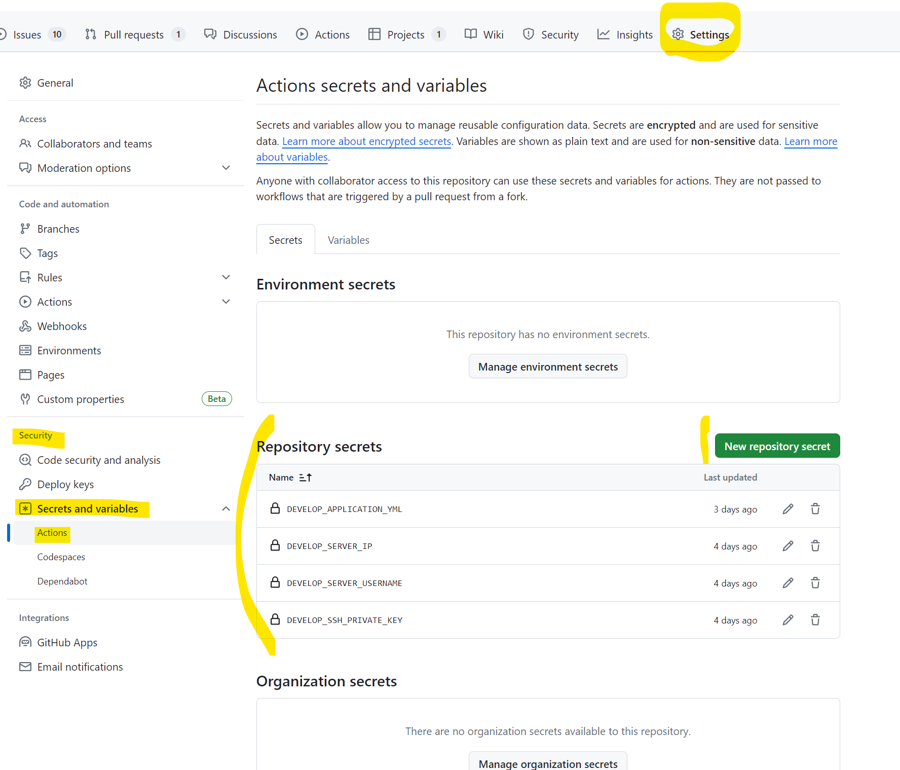 ์ด์ Repository secrets๋ฅผ ์ค์ ํด ๋๊ฒ์ด๋ค. ์ฌ๊ธฐ์ ์ค์ ํ๋๋ก cd-release.yml ํ์ผ์์ ๋ฐ์ดํฐ๋ฅผ ๊ฐ์ ธ์์ ์ ์์ด ์ผ์ด๋ ๊ฒ์ด๋ค.