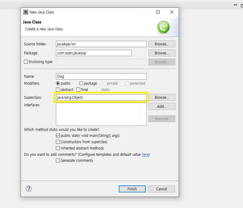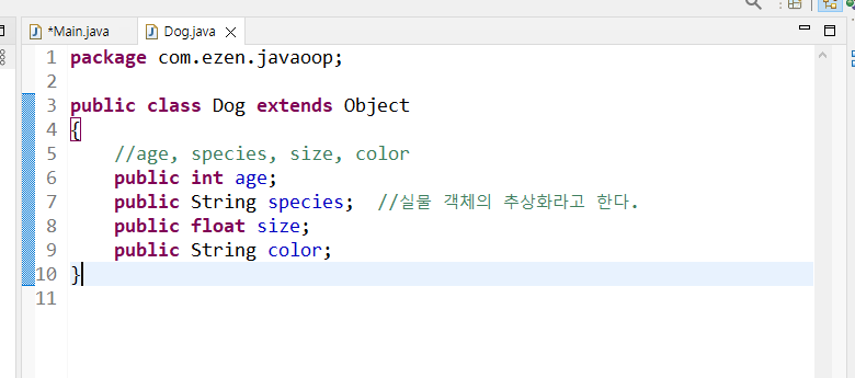 μ€λΈμ νΈ ν΄λμ€λ₯Ό μμλ°μμ Dog ν΄λμ€κ° λλ€.