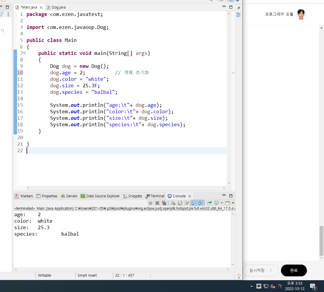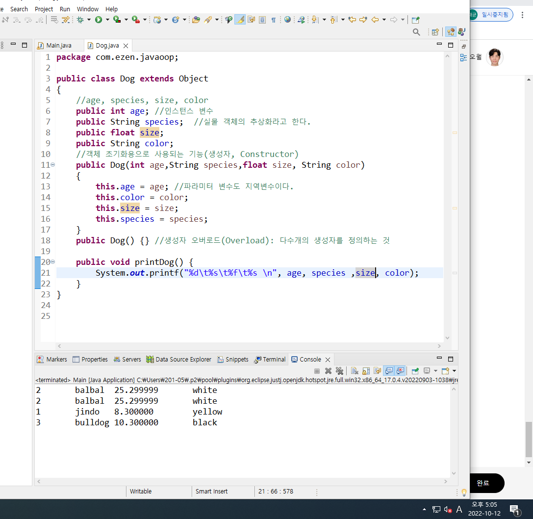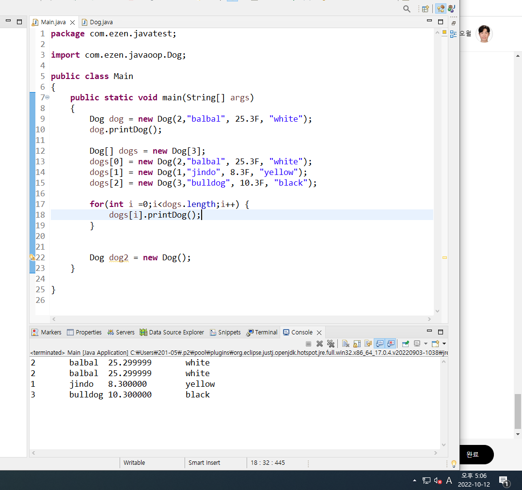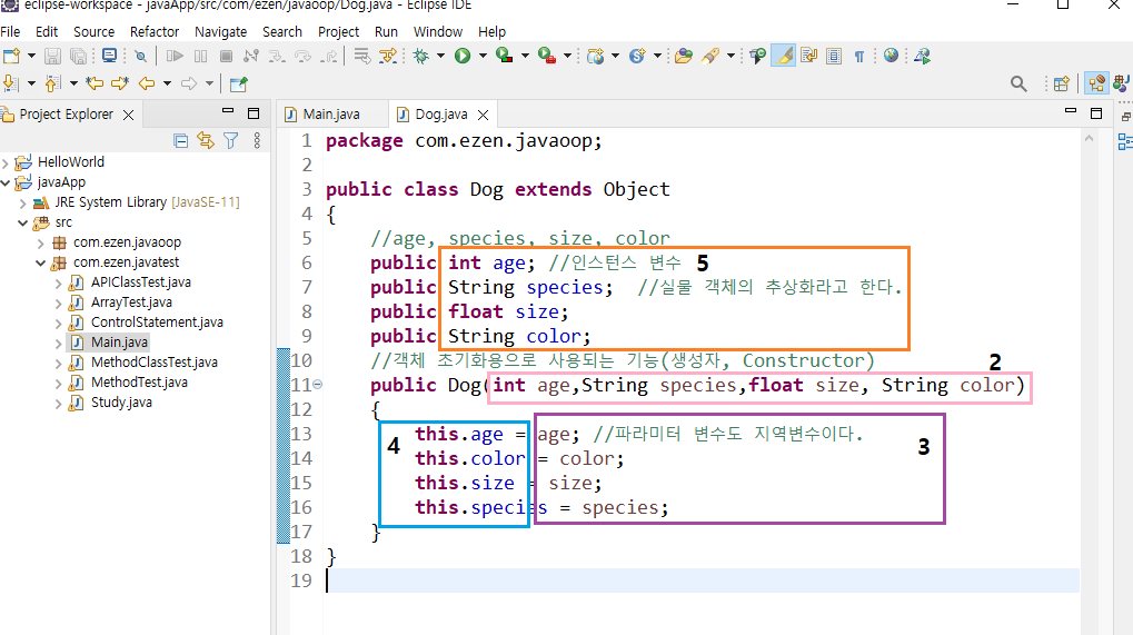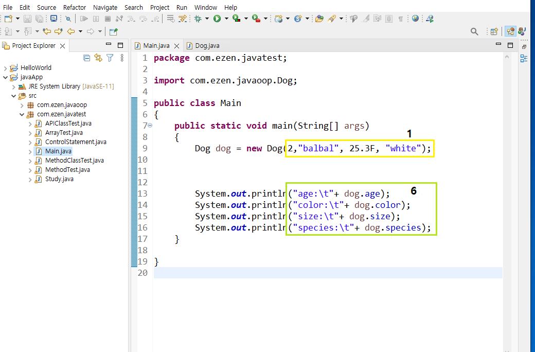 λ¨Όμ javatest ν¨ν€μ§μ μλ λ©μΈ ν΄λμ€μμ 1λ² κ°μ΄ μ 보λ₯Ό μ£Όλ©΄ νμ Dogκ°μ²΄κ° λ‘λλλ€.