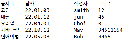 **κ²μνμ νλ©΄μ νμνκΈ° μν΄ , κΈμ λͺ©, λ μ§, μμ±μ, κΈλ΄μ©, ννΈμ, 4κ°μ§ νλͺ©μ΄ λν λλ 5κ°μ κΈμ board κ°μ²΄λ₯Ό μ΄μ©νμ¬ μ μ₯νκ³ λͺ©λ‘μ νλ©΄μ νμνμμ€.