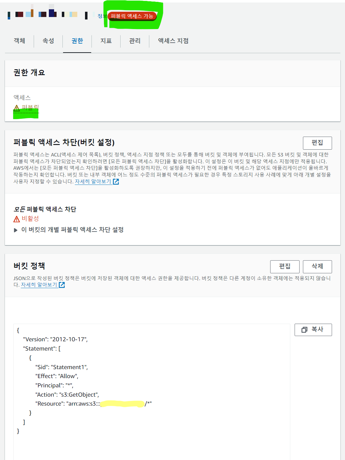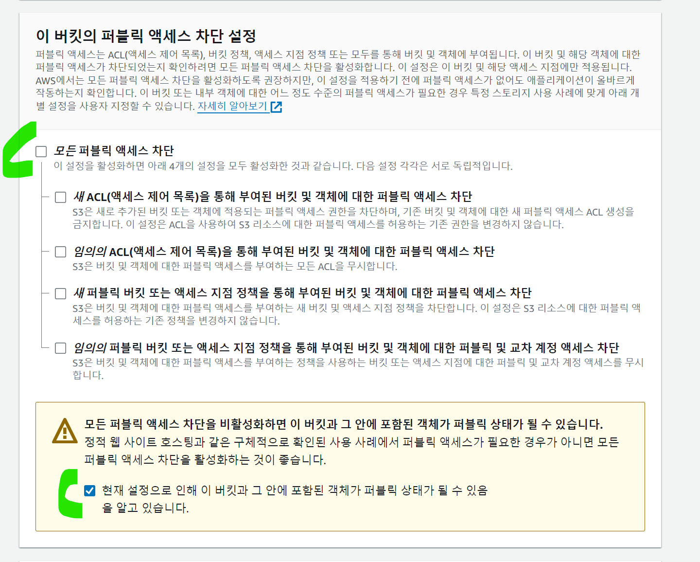 ํผ๋ธ๋ฆญํ S3๋ฅผ ๋ง๋ค๊ฒ์์ผ๋ก ์ก์ธ์ค ์ฐจ๋จ์ ํด์ ํ๊ณ ์ธ์งํ๊ณ ์์์ ํด๋ฆญํ๋ค.