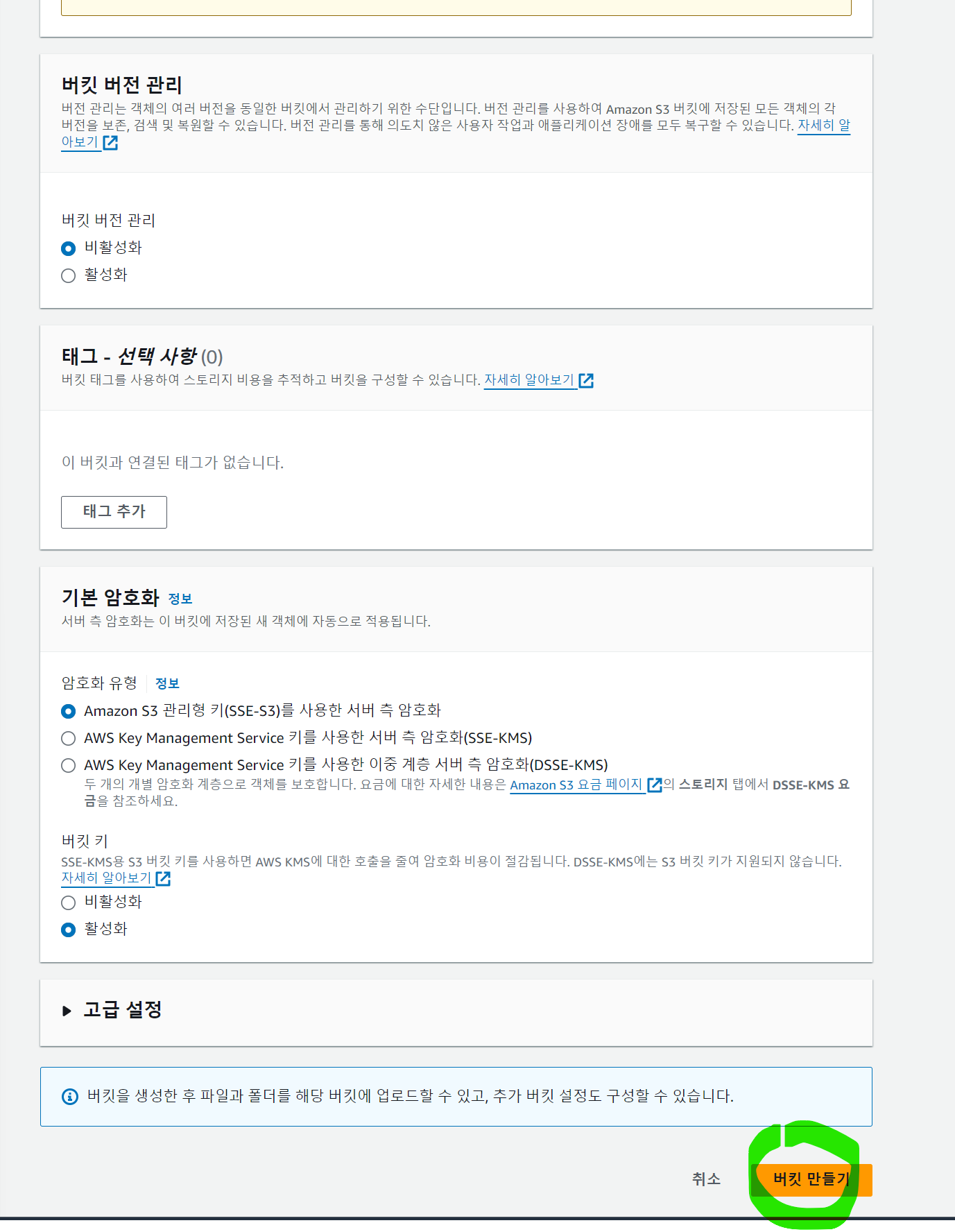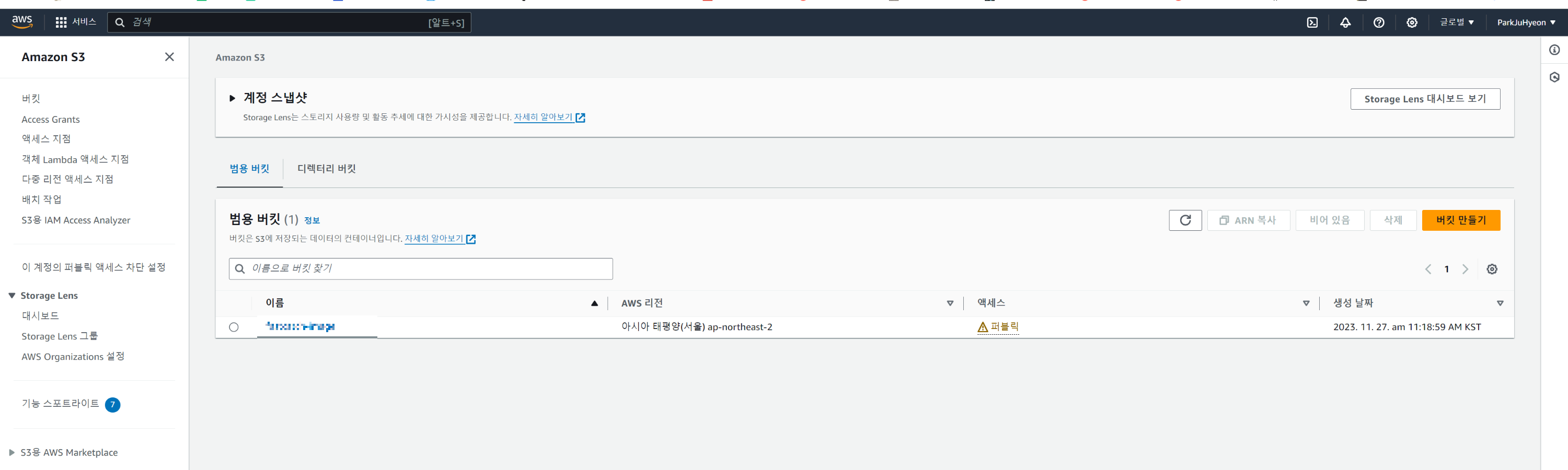 ๋จผ์ AWS์ S3 ์๋น์ค๋ก ๋ค์ด์จ๋ค. ์ฌ๊ธฐ์ ์ฃผํฉ์ ๋ฒํท ๋ง๋ค๊ธฐ๋ฅผ ํด๋ฆญํ๋ค.