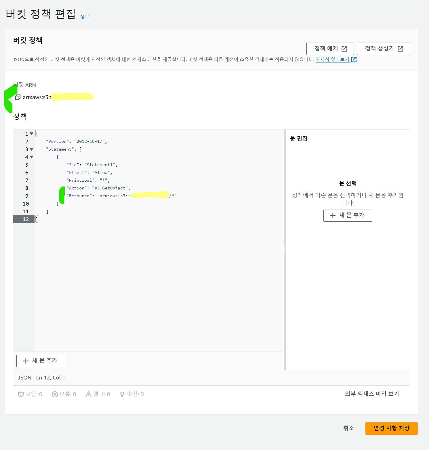 ์ด JSON ๋ฌธ์์ด์ ํธ์ง์ ๋๋ฌ์ ์์ฑํ๋๋ก ํ๋ค. Resource ์ ์์ ARN ์ ์๋ ์์ ์ ๋ฒํท๋ช ์ ๋ฃ๊ณ ๊ทธ ๋ค์ ๋ชจ๋ ํจ์ค๊ฐ ์ฌ์ ์๋๋ก ์์ผ๋์นด๋๋ฅผ ๋ฃ์ด์ค๋ค. ๊ทธ๋ฆฌ๊ณ ๋ณ๊ฒฝ์ฌํญ ์ ์ฅ์ ๋๋ฅธ๋ค!
