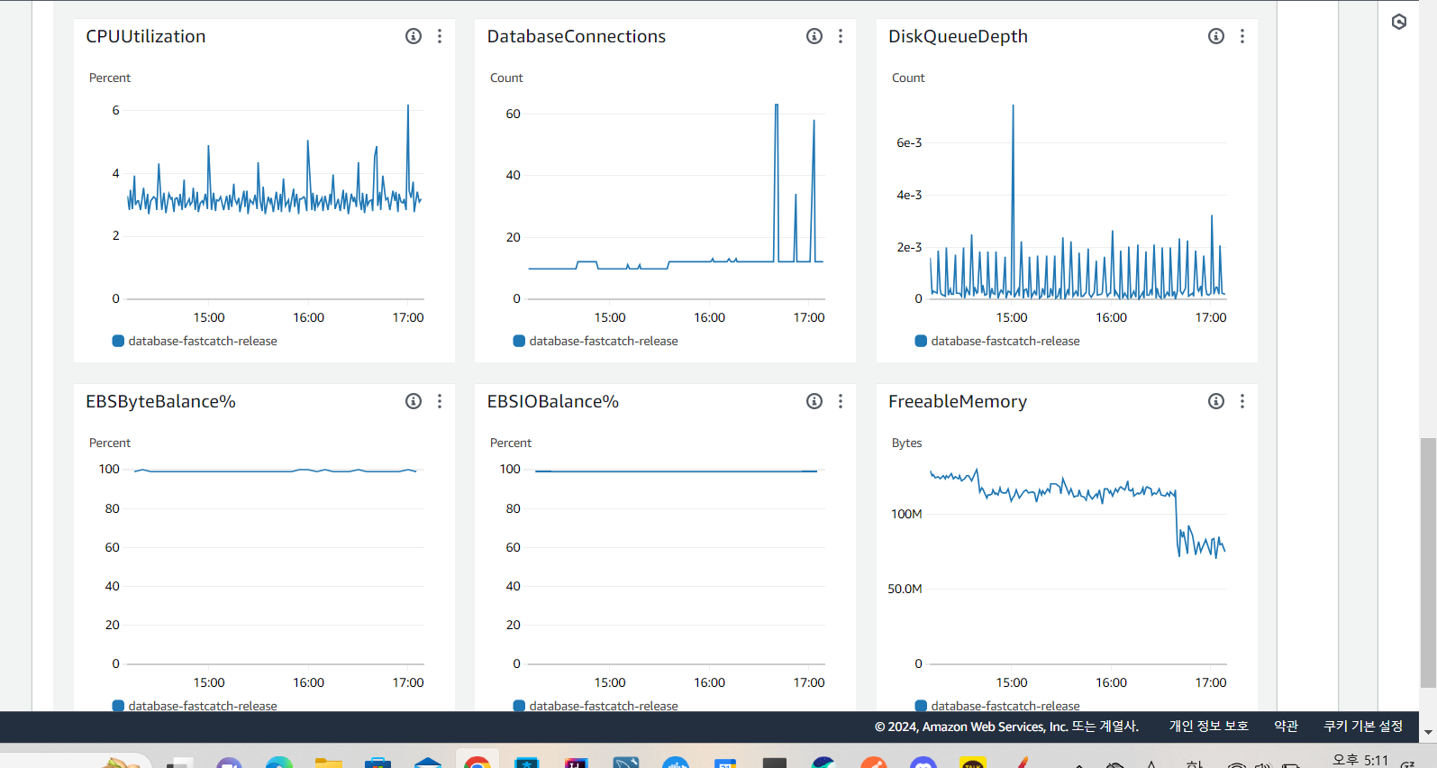 νμλ μΆκ°μ μΌλ‘ AWS CloudWatch κΉμ§ κ°μ΄ 보면μ μλ² CPU μ¬μ©λ, 컀λ₯μ μμ κ°μ© λ©λͺ¨λ¦¬λ λ³νκΉμ§ λͺ¨λν°λ§ ν΄λ³΄μλ€.
