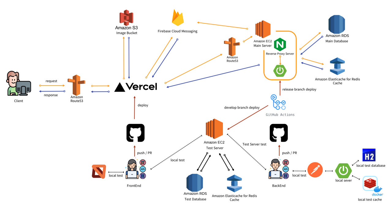 ์ค๋ฌด์์ ์งํ๋๋ ๊ฐ๋ฐ ํ๋ก์ธ์ค์ ๋ง๋ ํ๋ก์ธ์ค์ฒ๋ผ ์งํ๋ ํ๋ก์ ํธ๋ผ ๊ฐ๋ฐ๋จ๋ ๊ธฐํ๋จ๋ ๋งค์ฐ ํก์กฑํด ํ์ต๋๋ค. ํนํ๋ ํ ์คํธ ์๋ฒ์ ๋ณธ์๋ฒ๋ฅผ ๋ฐ๋ก ๋์๊ธฐ ๋๋ฌธ์ ์์ฒด์ ์ธ ํ ์คํธ๋ฅผ ์งํํ์์ต๋๋ค. ํ๋ก ํธ์์ ๋ธ๋์น๋ฅผ Vercel์ ๋ฐฐํฌํ ๋ ๋ฐฑ์๋์ฒ๋ผ ๋๋ฒจ๋กญ ๋ธ๋์น, ๋ฆด๋ฆฌ์ฆ ๋ธ๋์น ๊ฐ๊ฐ ๋ฐฐํฌ๊ฐ ๋๋์ง ๋ฌผ์์ง๋ง, ๋ ํฌ์งํ ๋ฆฌ๋น ํ๋ ๋ฐ์ ์๋๋ค ํ์ฌ, ํ๋ก ํธ ๋ฐฐํฌ ์ฌ์ดํธ๋ฅผ ๋ฐฑ์๋ ๋ณธ์๋ฒ์ ์ฐ๋ํ๊ณ ํ ์คํธ ์๋ฒ๋ ๊ฐ๋ฐ๋จ์์ ์์ฒด QA๋ฅผ ์งํํ๊ณ ๋ณธ์๋ฒ๋ก ์๋น์ค๋ฅผ ์ฎ๊ฒผ์ต๋๋ค.
