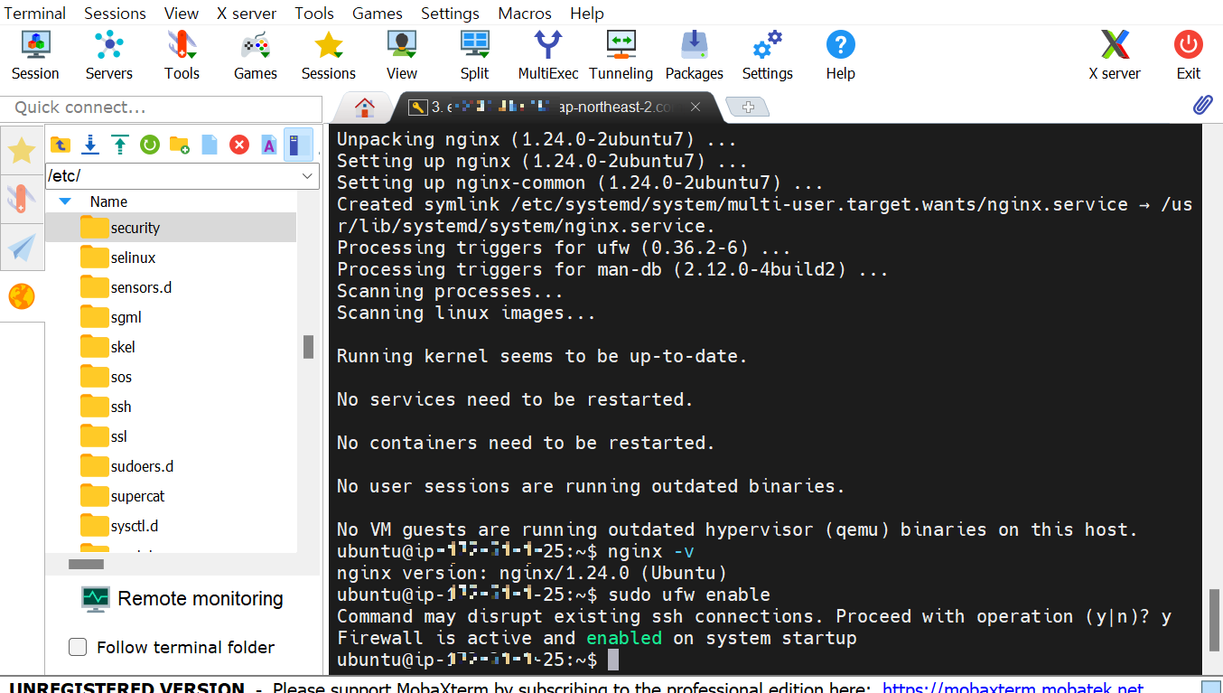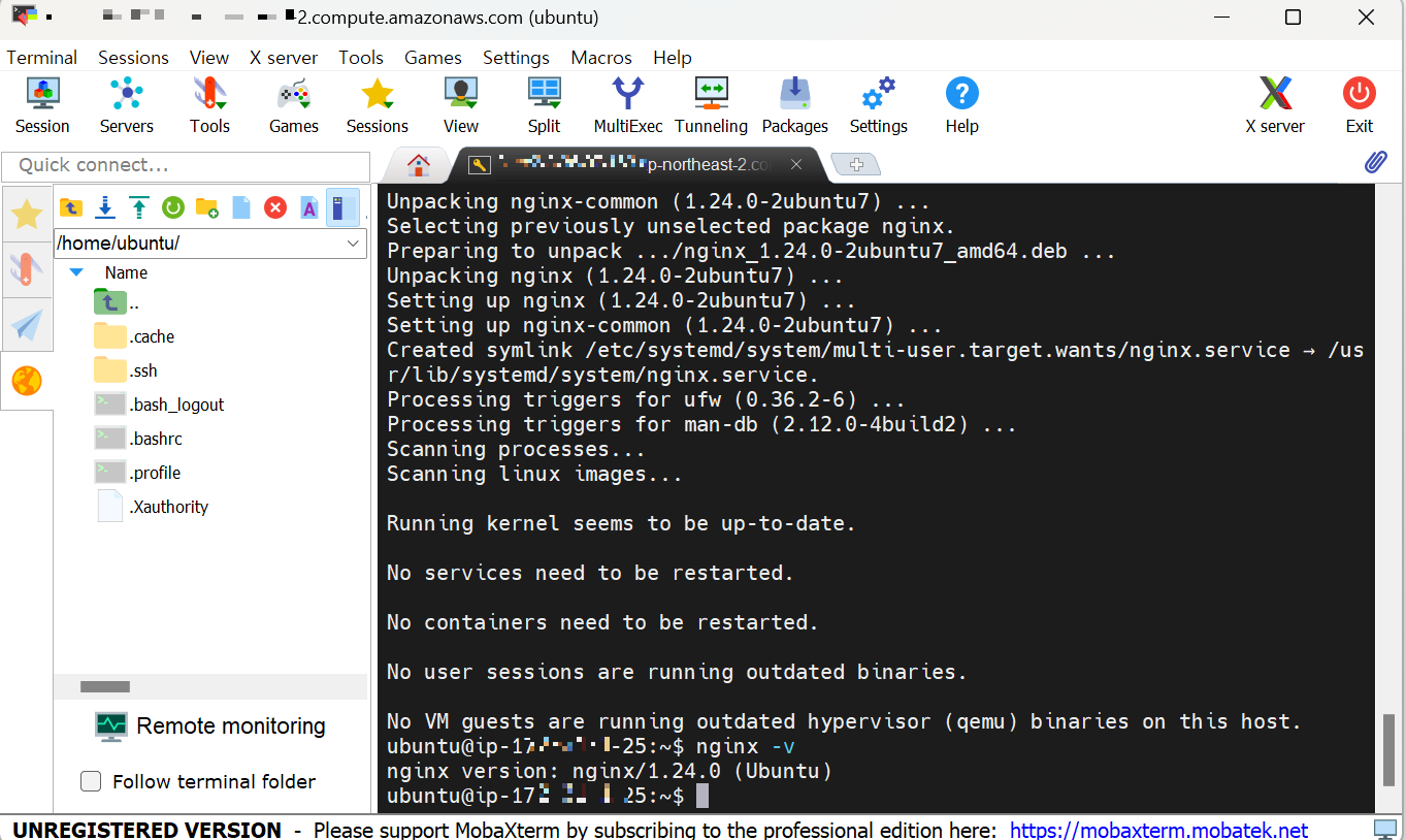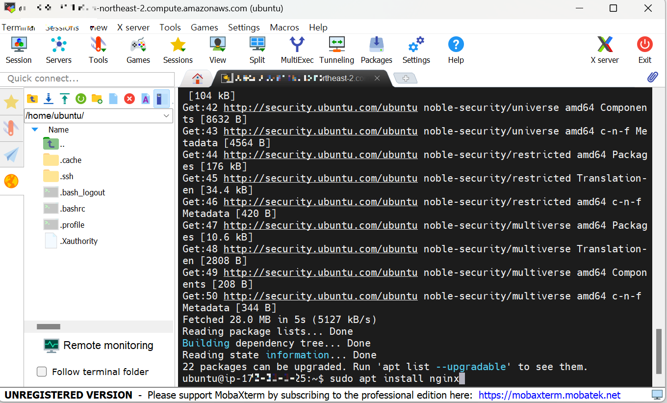 λ¨Όμ MobaXTerm μ΄λ λ€λ₯Έ μ격 μλ² μ μν΄μ μ΄μ©νμ¬ AWS EC2 μΈμ€ν΄μ€μ μ μν©λλ€. (μ°λΆν¬ μ΄μ체μ μ λ§λ μμμ΄λ―λ‘ λ€λ₯Έ μ΄μ체μ λ₯Ό μ¬μ©νμλ λΆμ κ·Έ μ΄μ체μ μ λ§λ λͺ λ Ήμ΄λ‘ μ λ ₯νμλ©΄ λ©λλ€.)