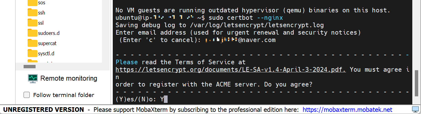 9. Certbotμ μ€μΉν©λλ€. μ€κ°μ λμ€λ μ©λ μ°¨μ§ λμλ Y λ₯Ό μ λ ₯ν΄μ€λλ€.