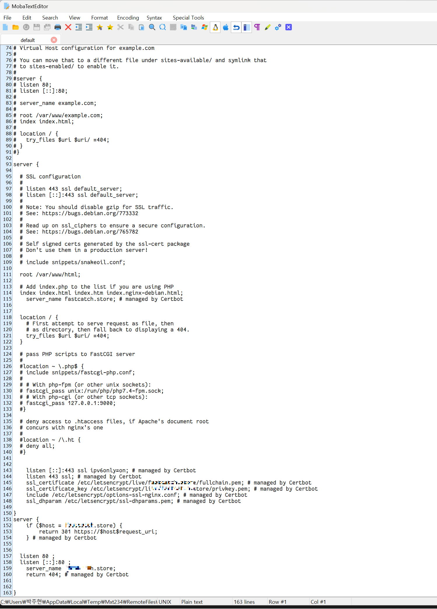 143 ~ 148 λ² μ§Έ μ€μ 보면 μ°λ¦¬κ° μ€μ ν΄μ€ Let’s Encryptμ Certbot μ ν΅ν΄ κ΄λ¦¬ λκ³ μλ€λ κ±Έ νμΈν μ μμ΅λλ€.