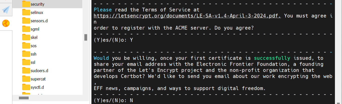 13. κ·Έλ€μμ Let's Encrypt νλ‘μ νΈμ 창립 ννΈλμΈ μ μ νλ‘ ν°μ΄ μ¬λ¨(Electronic Frontier Foundation, EFF)μμ κ·νμ μ΄λ©μΌ μ£Όμλ₯Ό 곡μ ν μμ¬κ° μλμ§ λ¬»λ λ¬Έκ΅¬κ° λνλκ² λ©λλ€. λμνκ² λλ©΄ Let's Encrypt νλ‘μ νΈμ κ΄λ ¨λ μμ, μΊ νμΈ, κ·Έλ¦¬κ³ λμ§νΈ μμ λ₯Ό μ§μνλ λ°©λ² λ±μ λν μ΄λ©μΌμ λ°μ μ μμ΅λλ€. μ κ΅³μ΄ λ°μ νμκ° μλ μΆμ΄μ Nλ₯Ό μ λ ₯νμ΅λλ€.