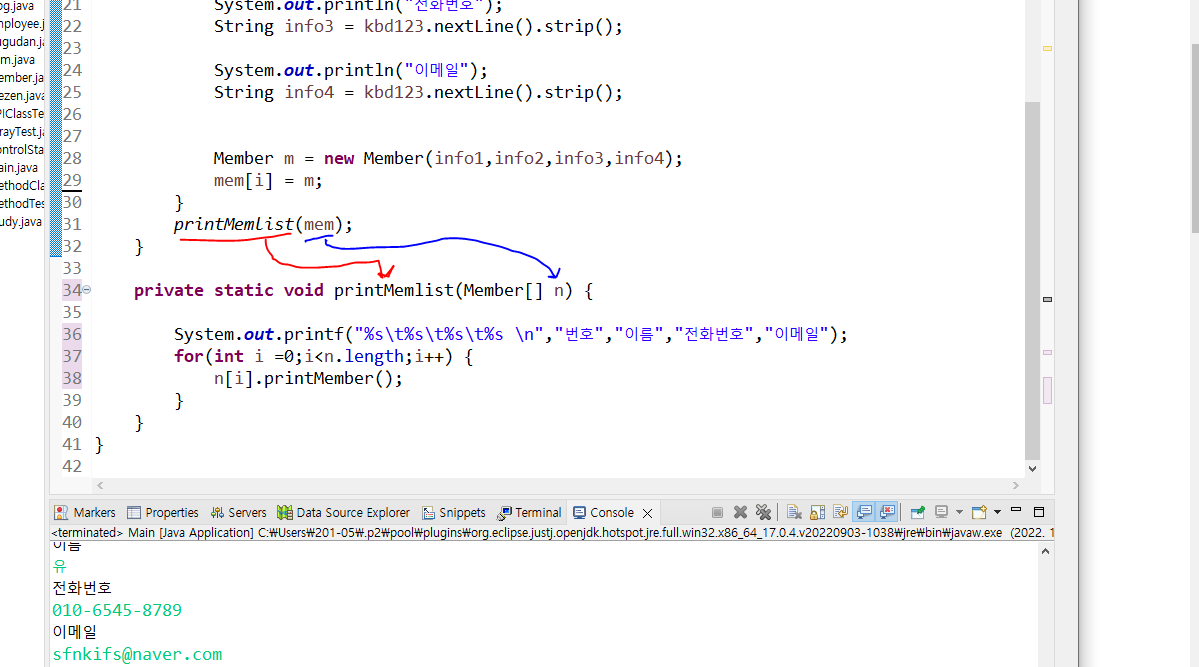 32ν printMemlist(Member[] m) νλΌλ―Έν°μ κ°μ λ£μ΄μ λ€λ₯Έ λ©μλμμλ μμ μλ μ§μλ³μλ₯Ό μΈ μ μκ² νλ€. nμΌλ‘μ printMemlistμ memκ°μ μΈ μ μκ² λλ€.