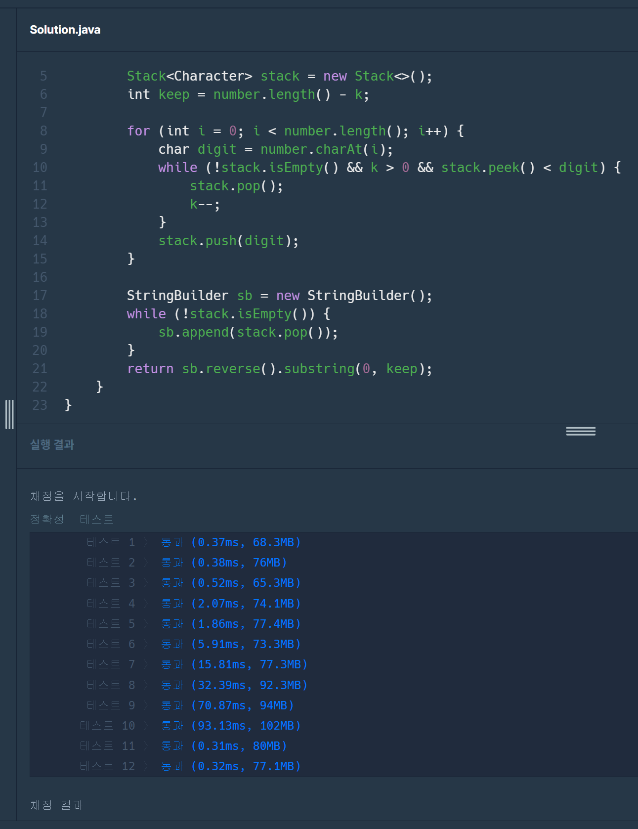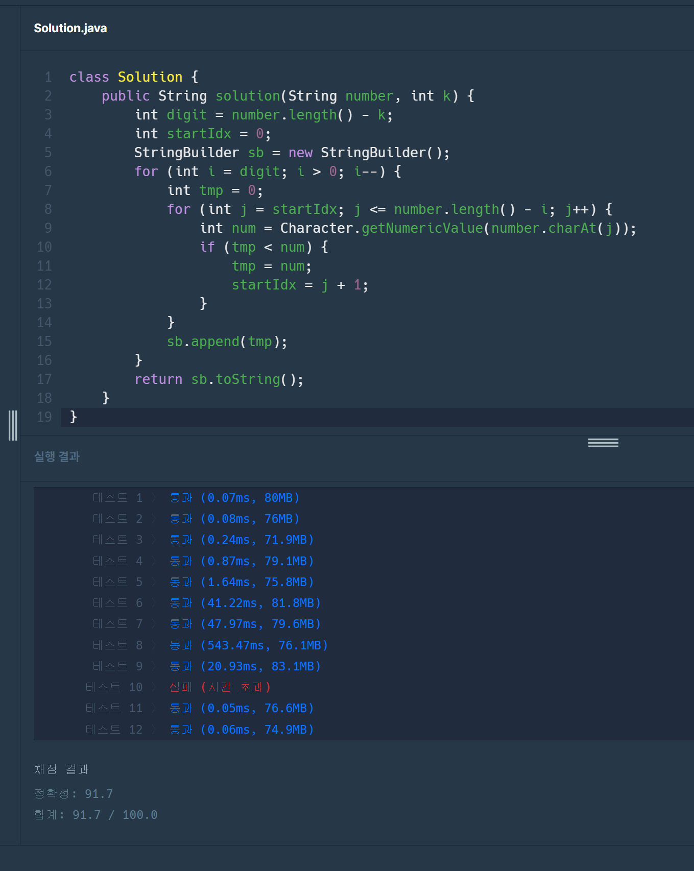 ๋ฌธ์์ด ํ์์ผ๋ก ์ซ์ number์ ์ ๊ฑฐํ ์์ ๊ฐ์ k๊ฐ solution ํจ์์ ๋งค๊ฐ๋ณ์๋ก ์ฃผ์ด์ง๋๋ค. number์์ k ๊ฐ์ ์๋ฅผ ์ ๊ฑฐํ์ ๋ ๋ง๋ค ์ ์๋ ์ ์ค ๊ฐ์ฅ ํฐ ์ซ์๋ฅผ ๋ฌธ์์ด ํํ๋ก return ํ๋๋ก solution ํจ์๋ฅผ ์์ฑํ์ธ์.