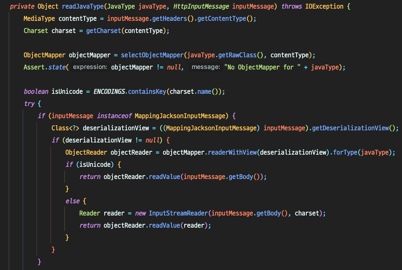 - JSON ๋ฐ์ดํฐ ๊ฒฝ์ฐ HttpMessageConverter ์ธํฐํ์ด์ค์ ๊ตฌํ์ฒด MappingJackson2HttpMessageConverter ํด๋์ค๋ฅผ ํตํด ์์ฒญ ๋ณธ๋ฌธ์ ์ฝ๊ณ , ํด๋น ๊ฐ์ฒด๋ก ๋ณํํ๋ค. MappingJackson2HttpMessageConverter ํด๋์ค์์์ ObjectMapper๋ฅผ ํ์ฉํ๋ค.