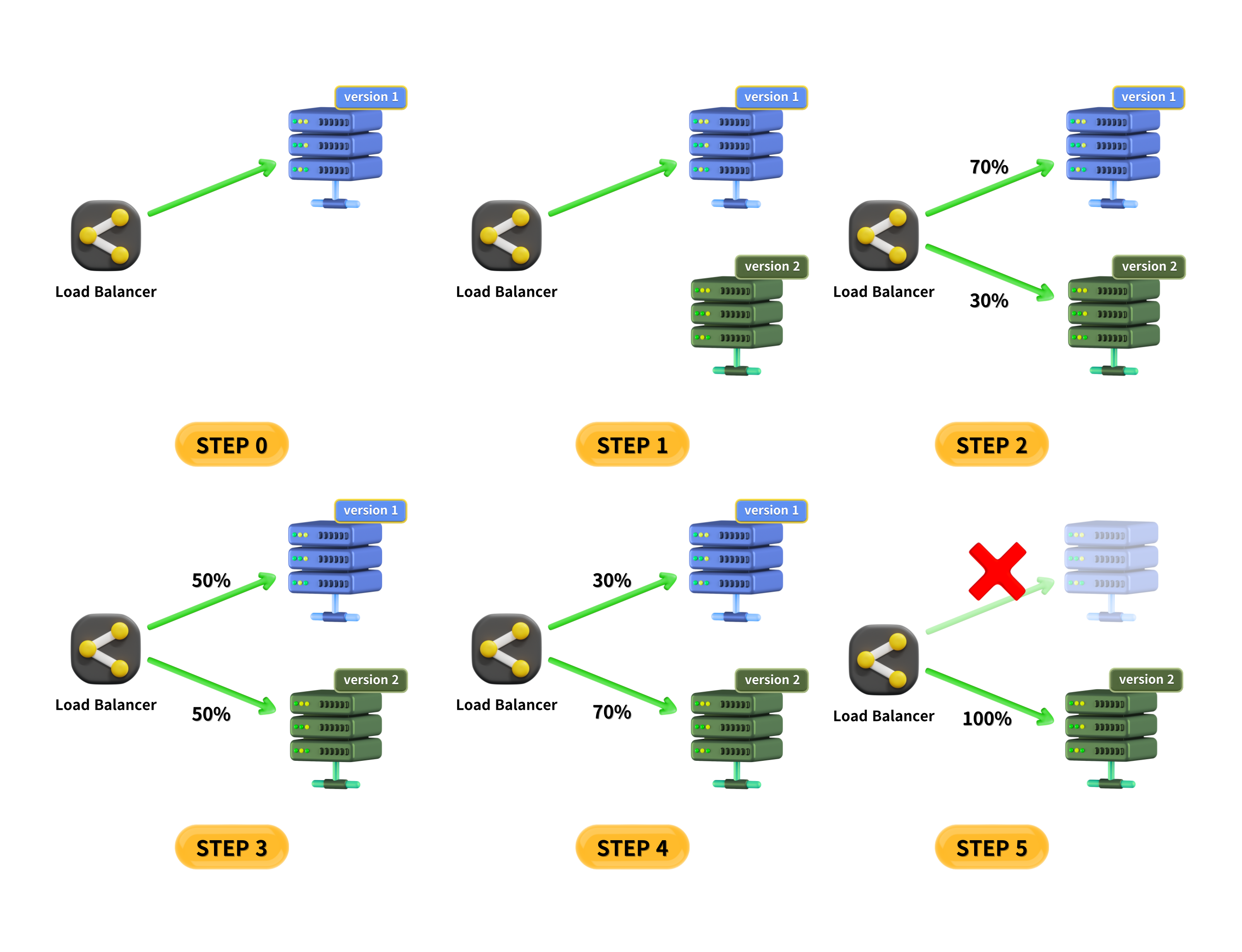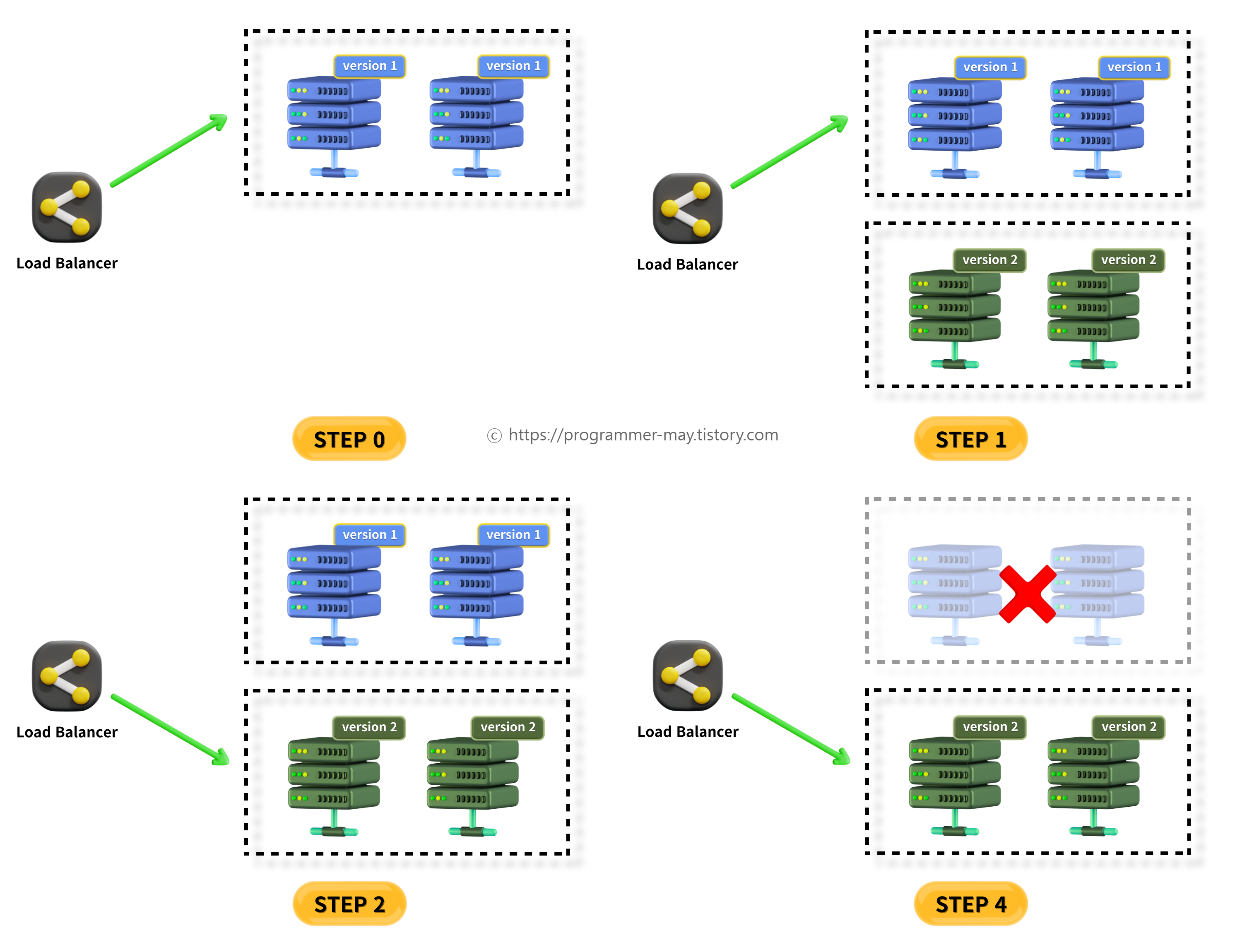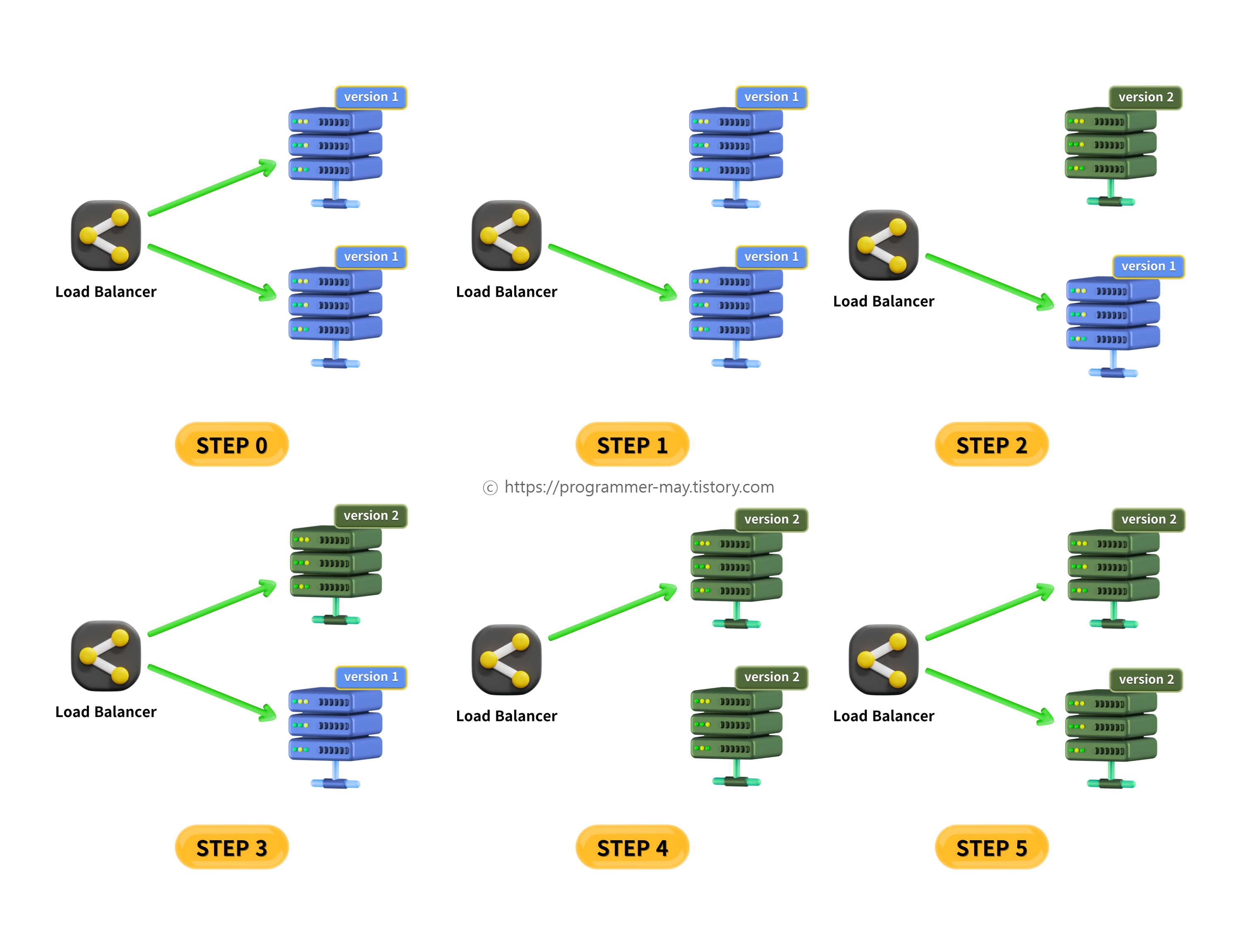 ๋ก๋ ๋ฐธ๋ฐ์์ ์ฐ๊ฒฐ๋์ด ์๋ ์๋ฒ๋ฅผ ํ๋ ์ถ๊ฐ ํ๊ฑฐ๋ ์ฐ๊ฒฐ์ ๋์ด์ ์๋ก์ด ๋ฒ์ ์ผ๋ก ๊ต์ฒดํ๊ณ ๋ก๋๋ฐธ๋ฐ์์ ๋ค์ ์ฐ๊ฒฐํฉ๋๋ค. ์ด ๊ณผ์ ์ ์ ์ง์ ์ผ๋ก ์งํํ์ฌ ์ต์ข ์ ์ผ๋ก๋ ๋ชจ๋ ํธ๋ํฝ์ด ์ ๋ฒ์ ์ ๋๋ฌํ ์ ์๊ฒ ํฉ๋๋ค. ์ด๋ฌํ ๊ณผ์ ์ ํตํด ์๋น์ค ์ค๋จ ์์ด ์ ํ๋ฆฌ์ผ์ด์ ์ ์ ๋ฐ์ดํธํ ์ ์์ต๋๋ค.