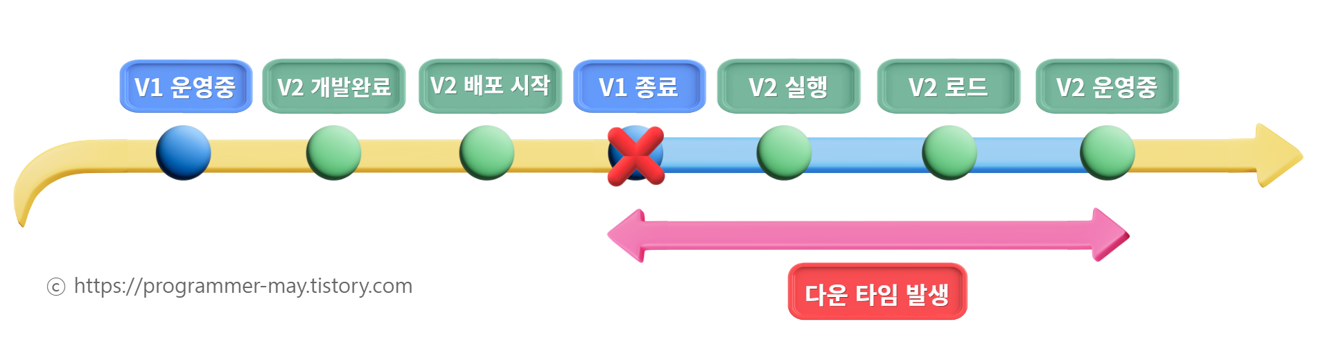 ๋ฌธ์ ๋ฅผ ์๋น์ค๋ฅผ ์ ๊ณตํ๊ธฐ ์ํด ๋ฐฐํฌํ๋ ๊ณผ์ ์์๋ ๋ค์ด ํ์์ด ๋ฐ์ํ ์ ์๋ค๋ ์ ์ ๋๋ค. ๋ฒ์ 1์ด ์ด์ฉ๋๊ณ ์๋ ์ํฉ์์ ๋ฒ์ 2๋ฅผ ๋ฐฐํฌํ๋ฉด, ๋ฒ์ 1์ด ์ข ๋ฃ๋๊ณ ๋ฒ์ 2๊ฐ ์คํ๋๋ ๋์ ๋ค์ดํ์์ด ๋ฐ์๋ฉ๋๋ค. ์ด๋ฌํ ๋ค์ดํ์์ ์ต์ํ ์์ผ์ ๋ฐฐํฌํ๋ ๋ฐฉ๋ฒ์ด ๋ฌด์ค๋จ ๋ฐฐํฌ์ ๋๋ค.
