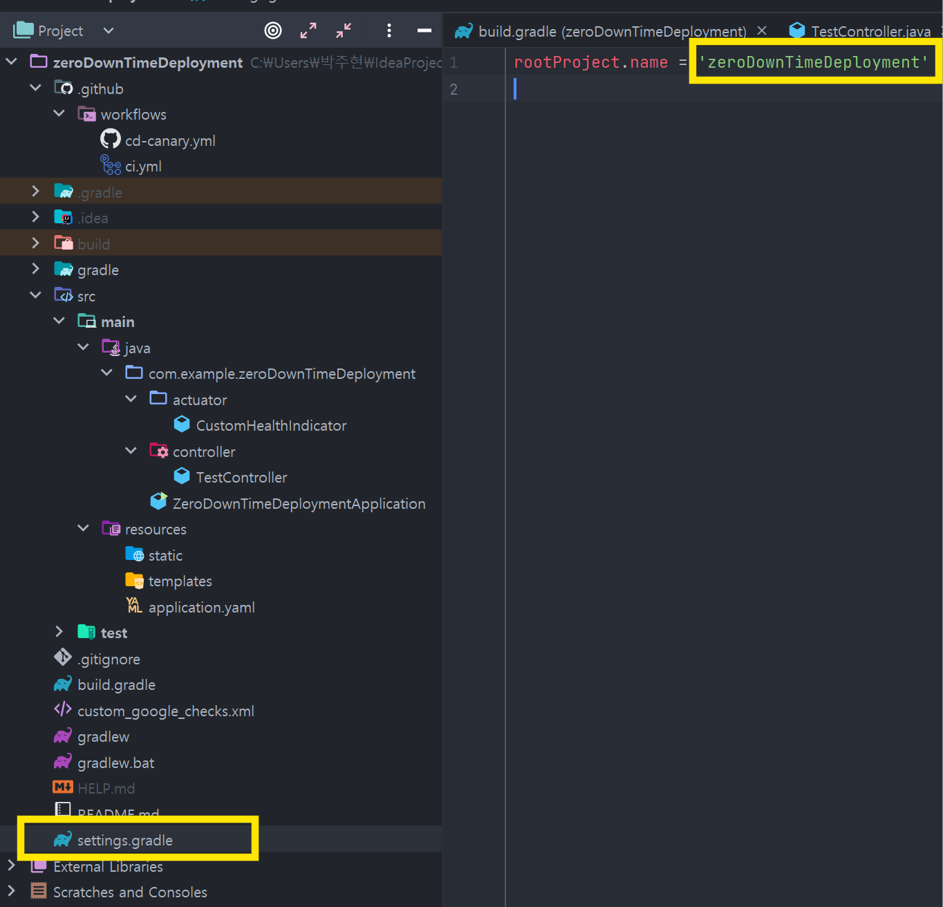 ๋ณธ์ธ์ ํ๋ก์ ํธ์ settings.gradle ์ rootProject.name ๊ฐ์ zeroDownTimeDeployment ๋์ ๋ฃ์ด ์ค๋๋ค.