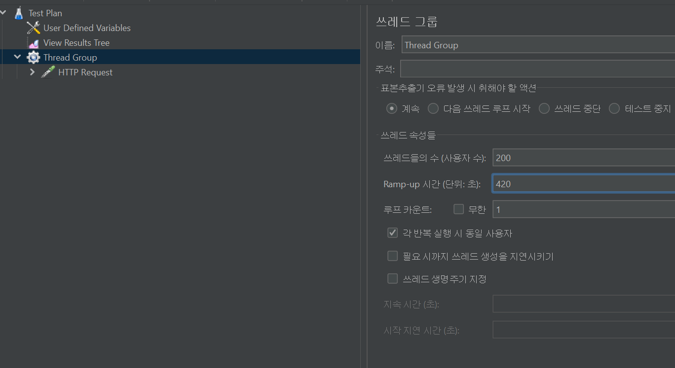 ์ํ์น ์ ์ด๋ฏธํฐ์ ํต์ฌ์ ์ฐ๋ ๋ ๊ทธ๋ฃน ์ค์ ์ ๋๋ค. ๊ทผ๋ฐ ์ ํฐ ์ฑ๋ฅ ํ ์คํธ ์๋๋ฆฌ์ค๋ฅผ ์ ๊ฒฝ์ธ ๊ฑด ์๋๋ผ์, ๋๋ต 7๋ถ์ ๊ธฐ์ค์ผ๋ก ์ ๋นํ ์์ฒญ ๊ฐ๊ฒฉ์ ๋ณด๋ด๊ธฐ ์ํด Ramp-up ์๊ฐ์ 420 ์ ์ฌ์ฉ์ ์๋ฅผ 200 ํ๊ฒ ์ต๋๋ค.