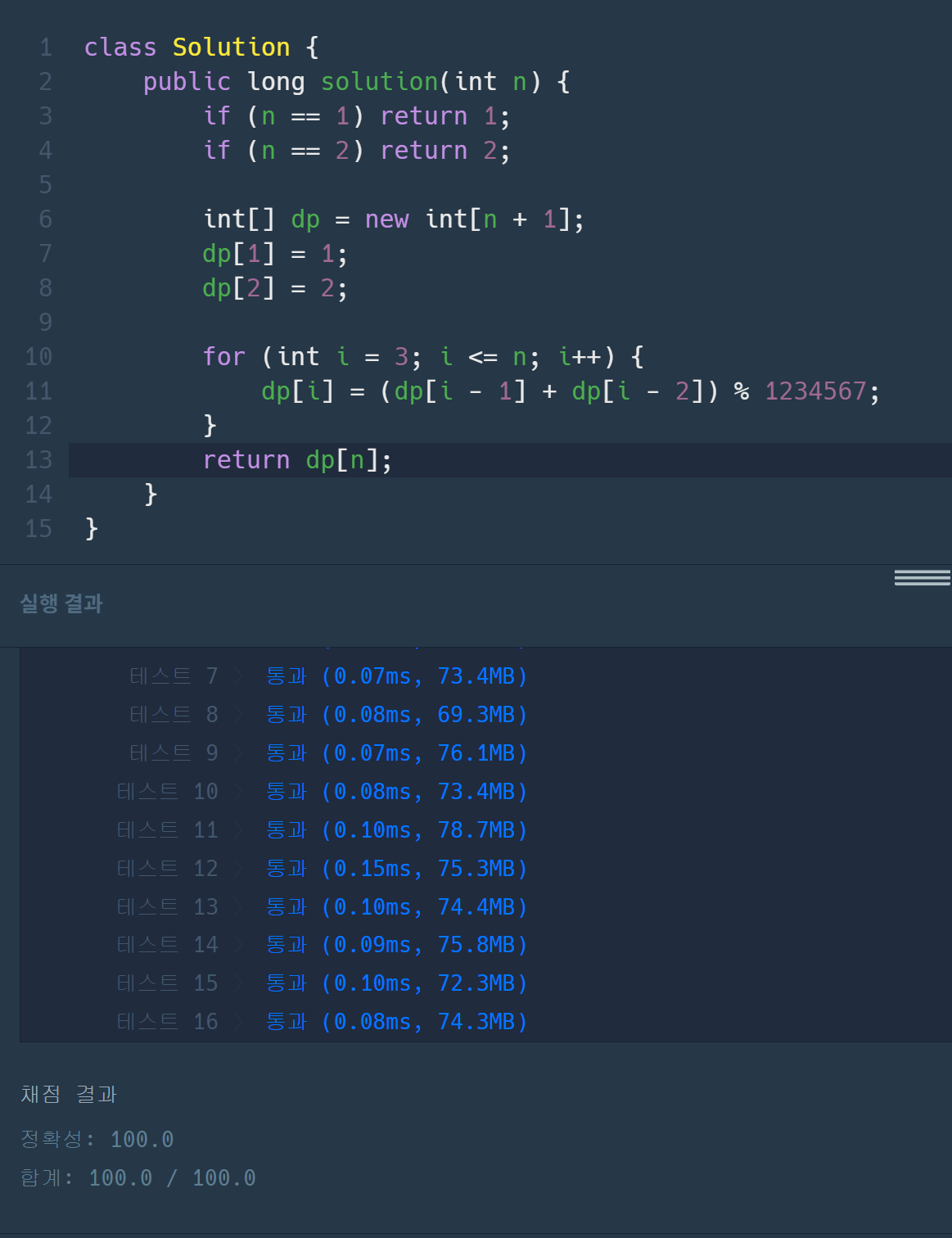 ์ 5๊ฐ์ง ๋ฐฉ๋ฒ์ผ๋ก ๋งจ ๋ ์นธ์ ๋๋ฌํ ์ ์์ต๋๋ค. ๋ฉ๋ฆฌ๋ฐ๊ธฐ์ ์ฌ์ฉ๋ ์นธ์ ์ n์ด ์ฃผ์ด์ง ๋, ํจ์ง์ด๊ฐ ๋์ ๋๋ฌํ๋ ๋ฐฉ๋ฒ์ด ๋ช ๊ฐ์ง์ธ์ง ์์๋ด, ์ฌ๊ธฐ์ 1234567๋ฅผ ๋๋ ๋๋จธ์ง๋ฅผ ๋ฆฌํดํ๋ ํจ์, solution์ ์์ฑํ์ธ์. ์๋ฅผ ๋ค์ด 4๊ฐ ์