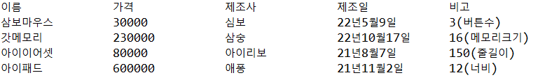"μ΄λ¦","κ°κ²©","μ μ‘°μ¬","μ μ‘°μΌ","λΉκ³ ");