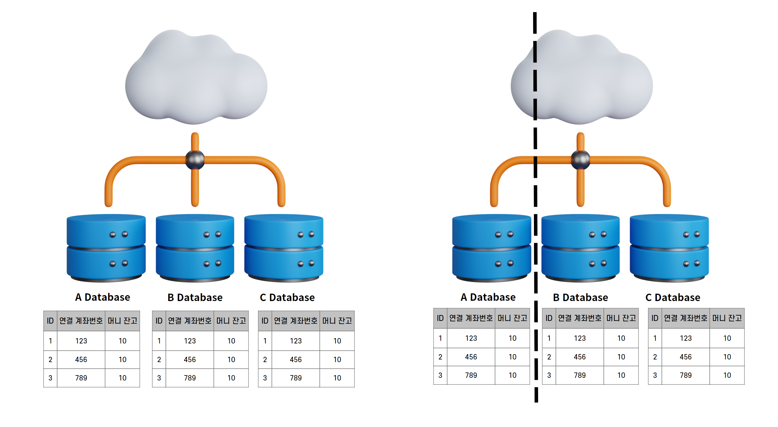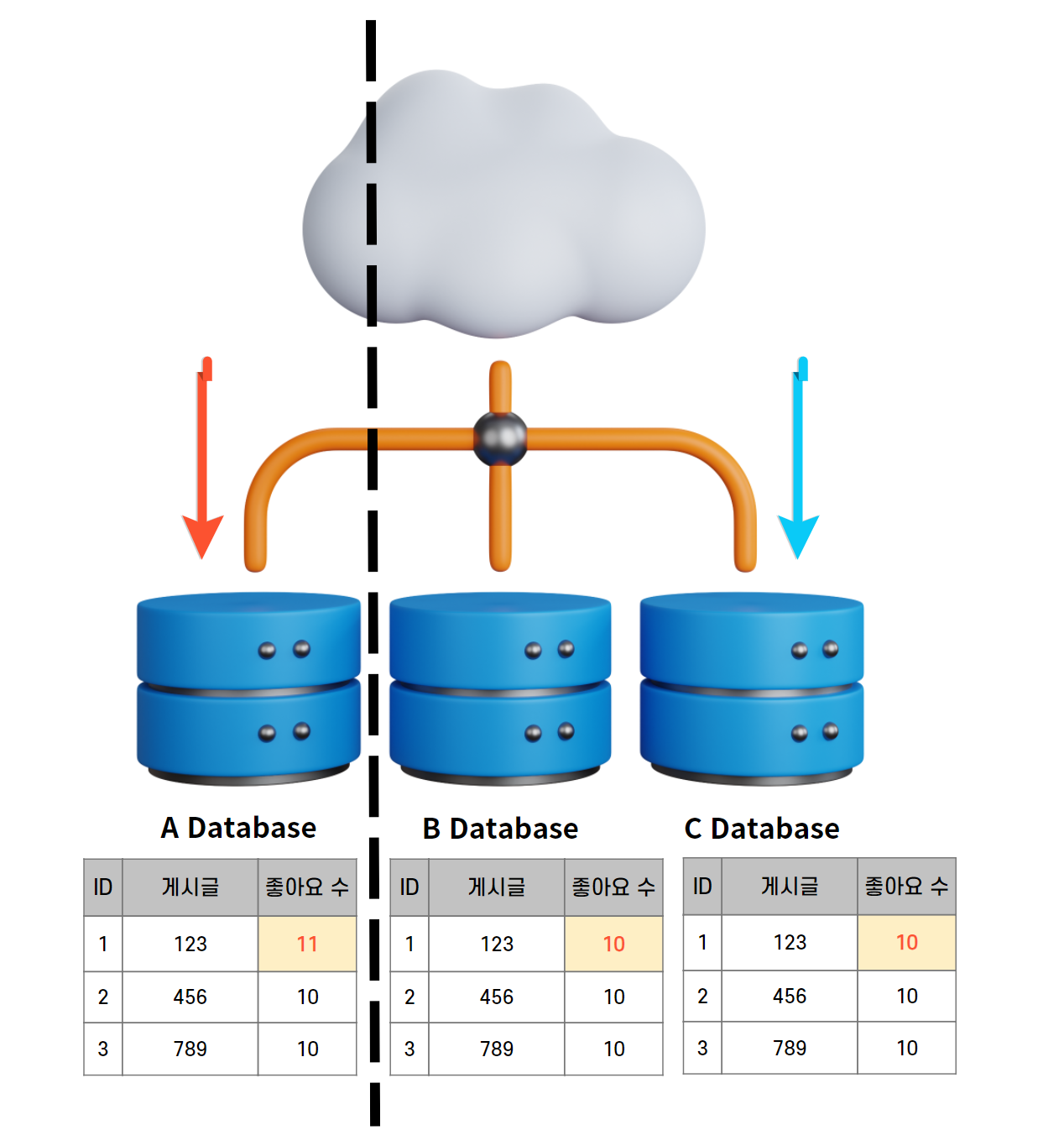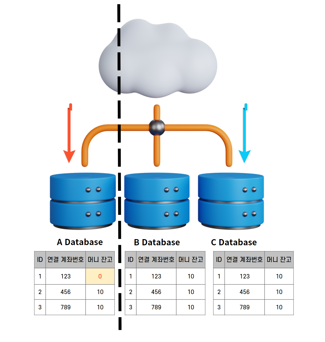 - μμ²μ΄ A λ°μ΄ν°λ² μ΄μ€ λ Έλλ‘ κ°λ κ²½μ°μ B λ°μ΄ν°λ² μ΄μ€ λ Έλλ‘ κ°λ κ²½μ°κ° μλ€.