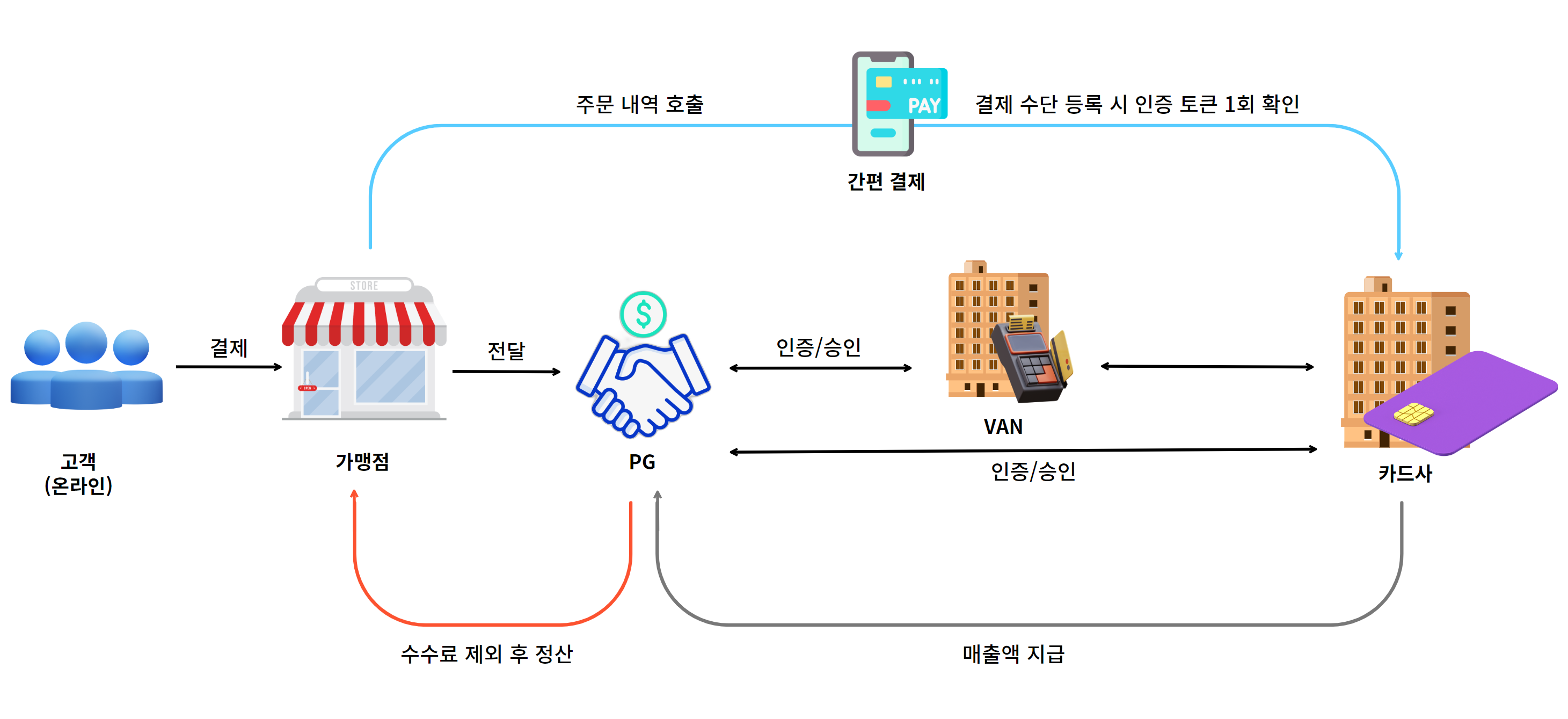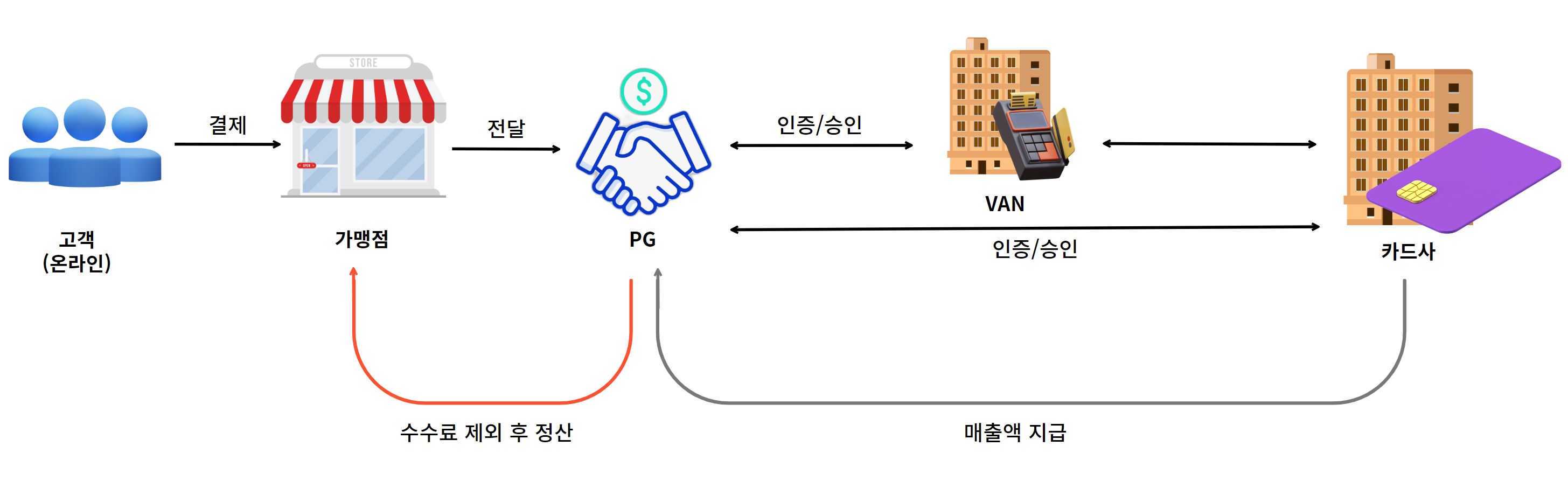 PG ์ฌ๋ ์๋น์์ ๊ฒฐ์ ์ ๋ณด๋ฅผ ์ธ์ฆํ๊ณ ์น์ธ์ ๋ฐ์ ํ ์นด๋์ฌ์ ์ ๋ฌํ๊ฒ ๋๋ค. ๊ฒฐ์ ์น์ธ์ด ์ด๋ค์ก๋ค๋ฉด ๋งค์ถ ์ ํ๊ฐ ์นด๋์ฌ์ ์ ๋ฌ๋๊ณ , ์นด๋์ฌ๋ ๊ฒฐ์ ๋๊ธ์ PG์ฌ์ ์ง๊ธํ๋ค. PG์ฌ๋ ์ ์ฐ๋ฐ์ ๋๊ธ์ ์์๋ฃ๋ฅผ ์ ์ธํ๊ณ ๊ฐ๋งน์ฃผ๋ค์๊ฒ ์ ์ฐํ๋ค.