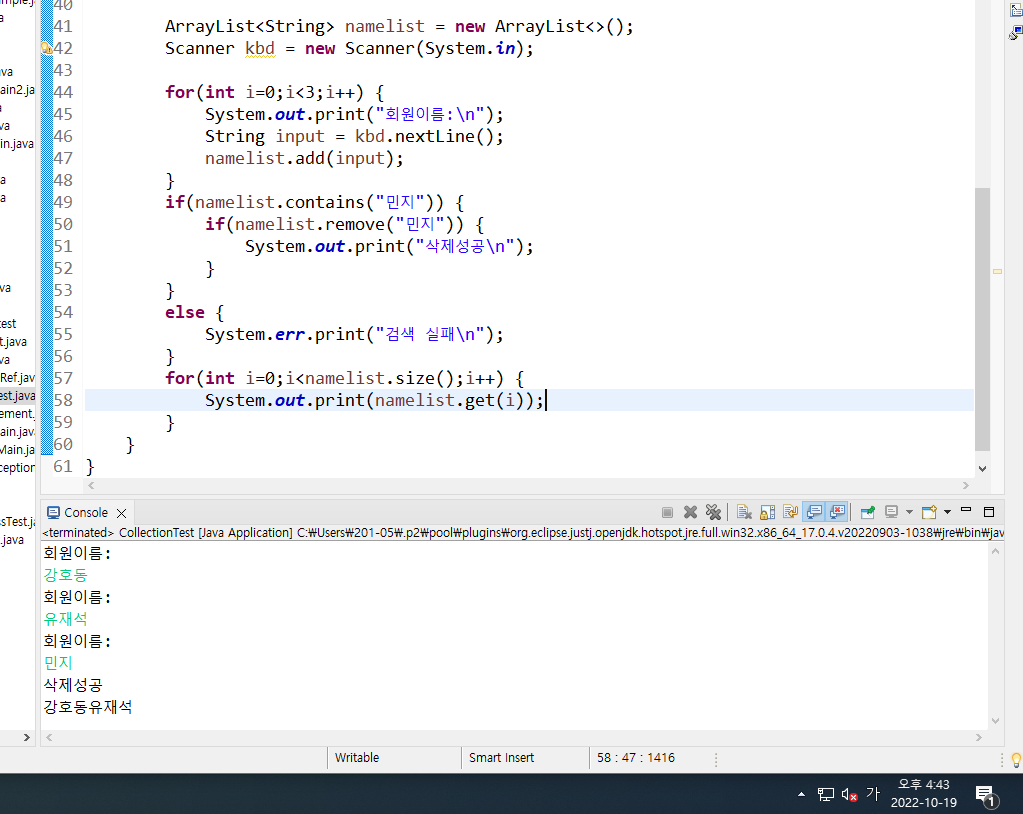 **ํค๋ณด๋์์ 3๋ช ์ ํ์ ์ด๋ฆ์ ์ ๋ ฅํ์ฌ Arraylist ์ ์ ์ฅํ๋ค.