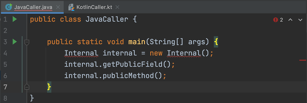 ๋๊ฐ์ด ์๋ฐ ์ฝ๋์์ ์ฝํ๋ฆฐ ํด๋์ค๋ฅผ ์ ๊ทผํ๊ฒ๋๋ฉด ๊ฐ์ ์ปดํ์ผ ์๋ฌ๊ฐ ์๊ธด๋ค.