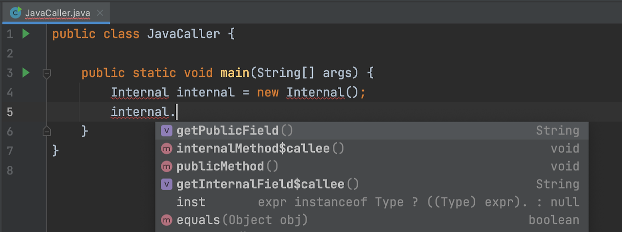 internal field์ internal method์ ์ ๊ทผํ๋ ค๊ณ ํ๋ฉด ์ด๋ฆ์ด ๋ฐ๋์ด์ ธ์๋ค. ์์์ ๋งํ Name Mangling ๋๋ฌธ์ด๋ค. internalMethod$callee()๋ getInernalField$callee()๋ ๋ถ๋ฅด๋๋ผ๋ ๋น๋๋ ๋๋ค.