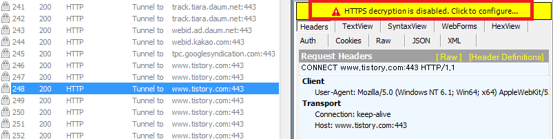 HTTPS νμμ "Capture HTTPS CONNECTs" λ° "Decrypt HTTPS traffic 체ν¬"