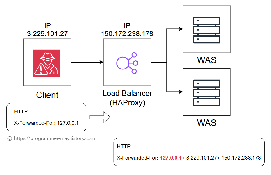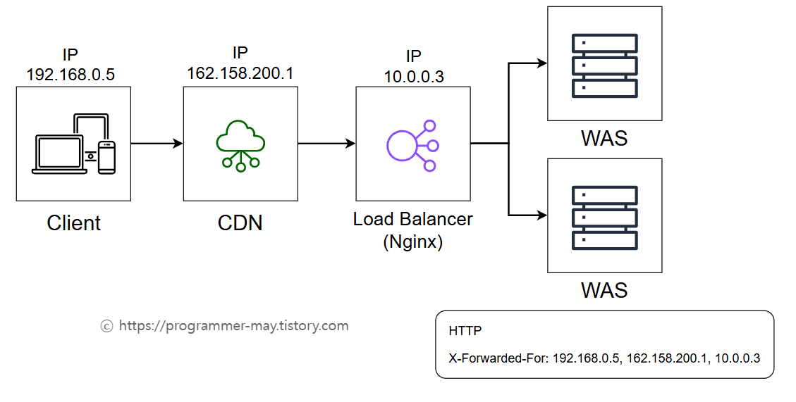 ์์ฒญ์ ์ ๋ฌํ ๋ ๊ธฐ์กด์ X-Forwarded-For ํค๋๊ฐ ์์ผ๋ฉด ๊ทธ ๋ค์ ์๊ธฐ IP๋ฅผ ์ถ๊ฐ(append) ํฉ๋๋ค.